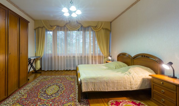 В номере: зеркало, кровать двуспальная, набор мягкой мебели, прикроватные тумбочки, стол, стулья, шкаф, шкаф для посуды, телевизор, холодильник, чайный набор посуды, электрочайник