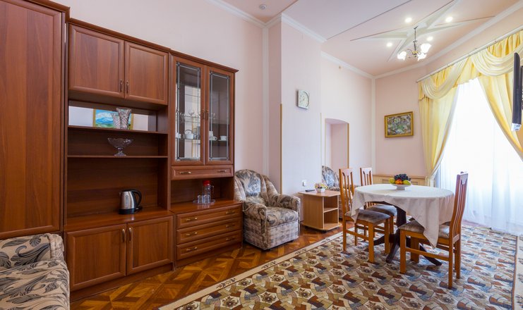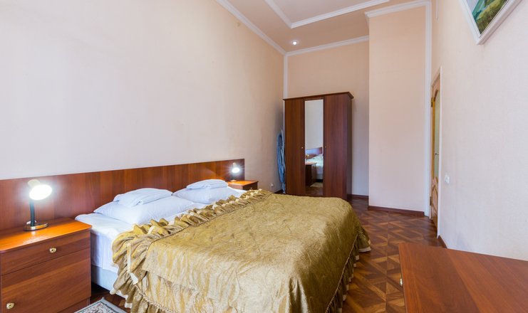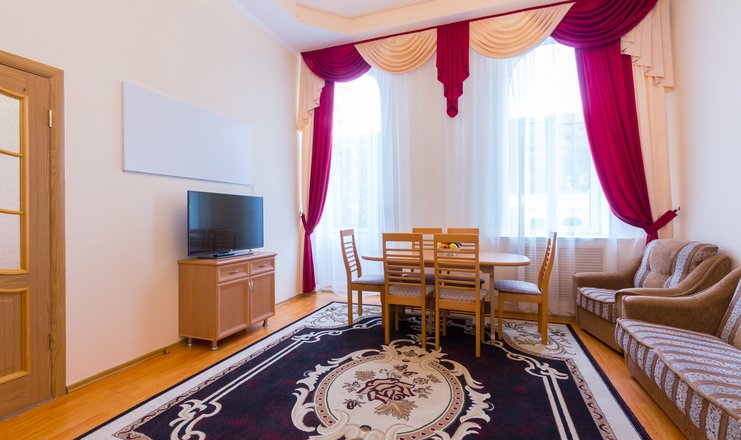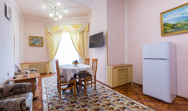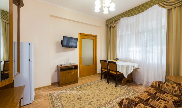 В номере: диван, кресла, стол, стулья, тахта, тумба, шкаф-купе, шкаф для посуды, телевизор, холодильник, чайный набор посуды, электрочайник