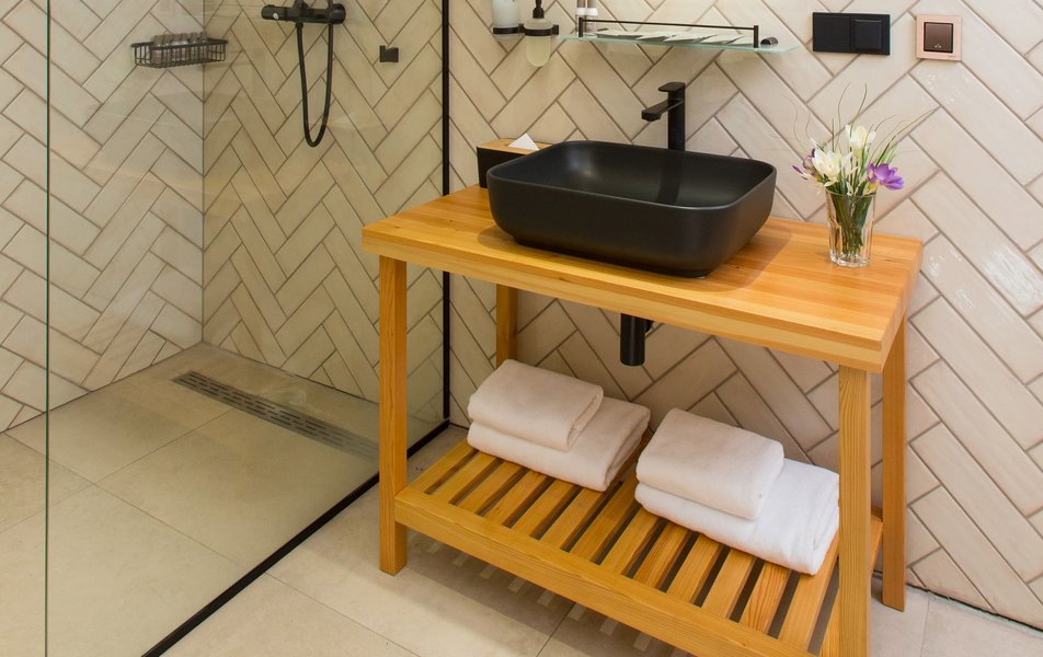 Санузел: душ, раковина, унитаз, тапочки, туалетные принадлежности, фен, халат