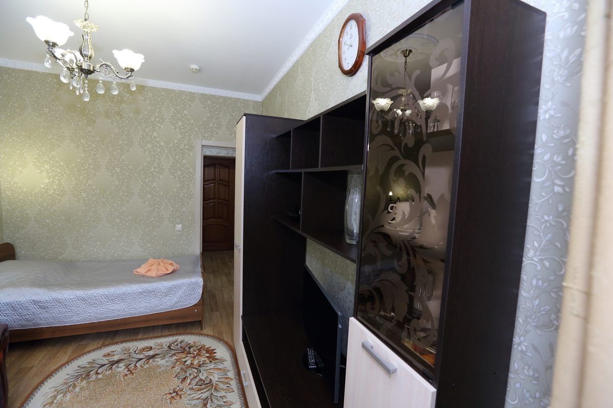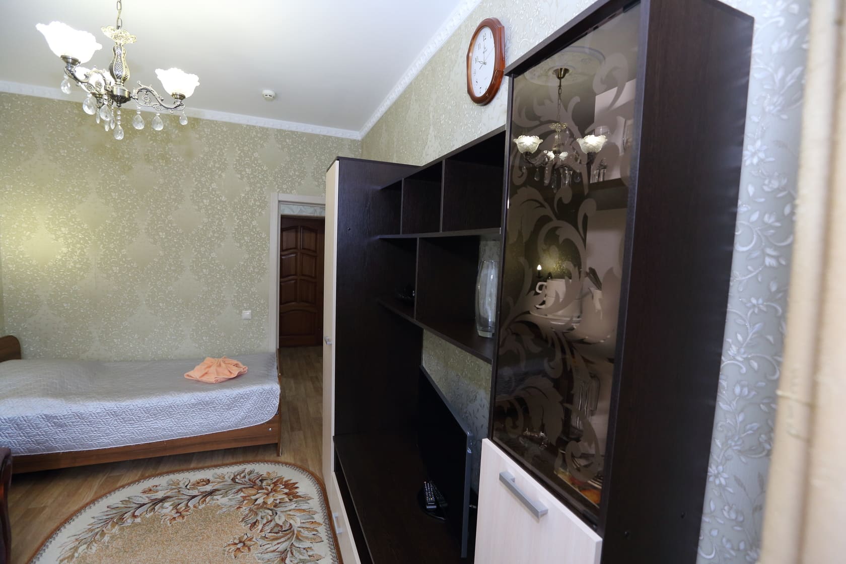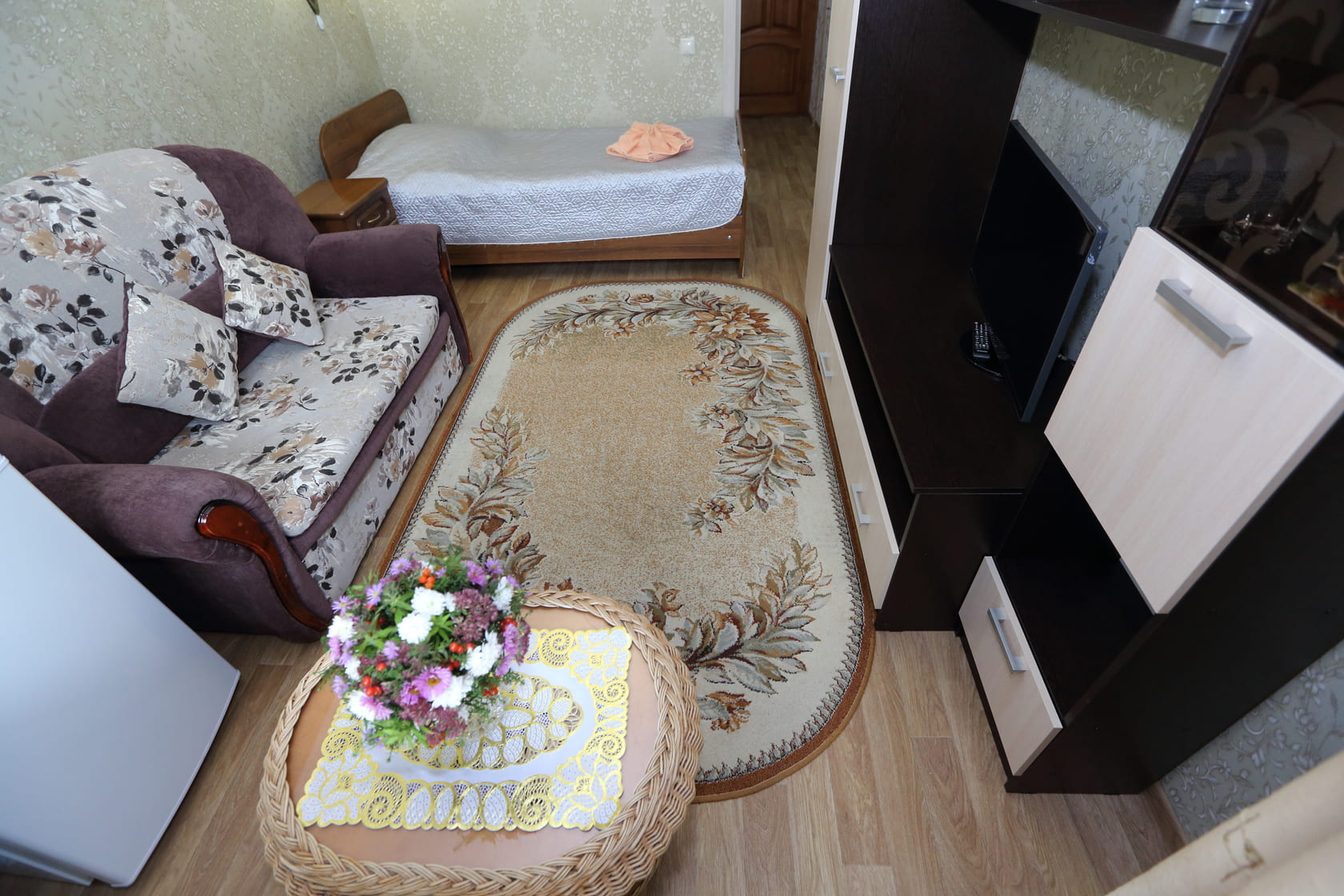 Комната: мебельная стенка, телевизор, кровать, диван, прикроватная тумбочка, холодильник, чайник электрический, чайный столик, комплект чайной посуды, набор полотенец, утюг.
