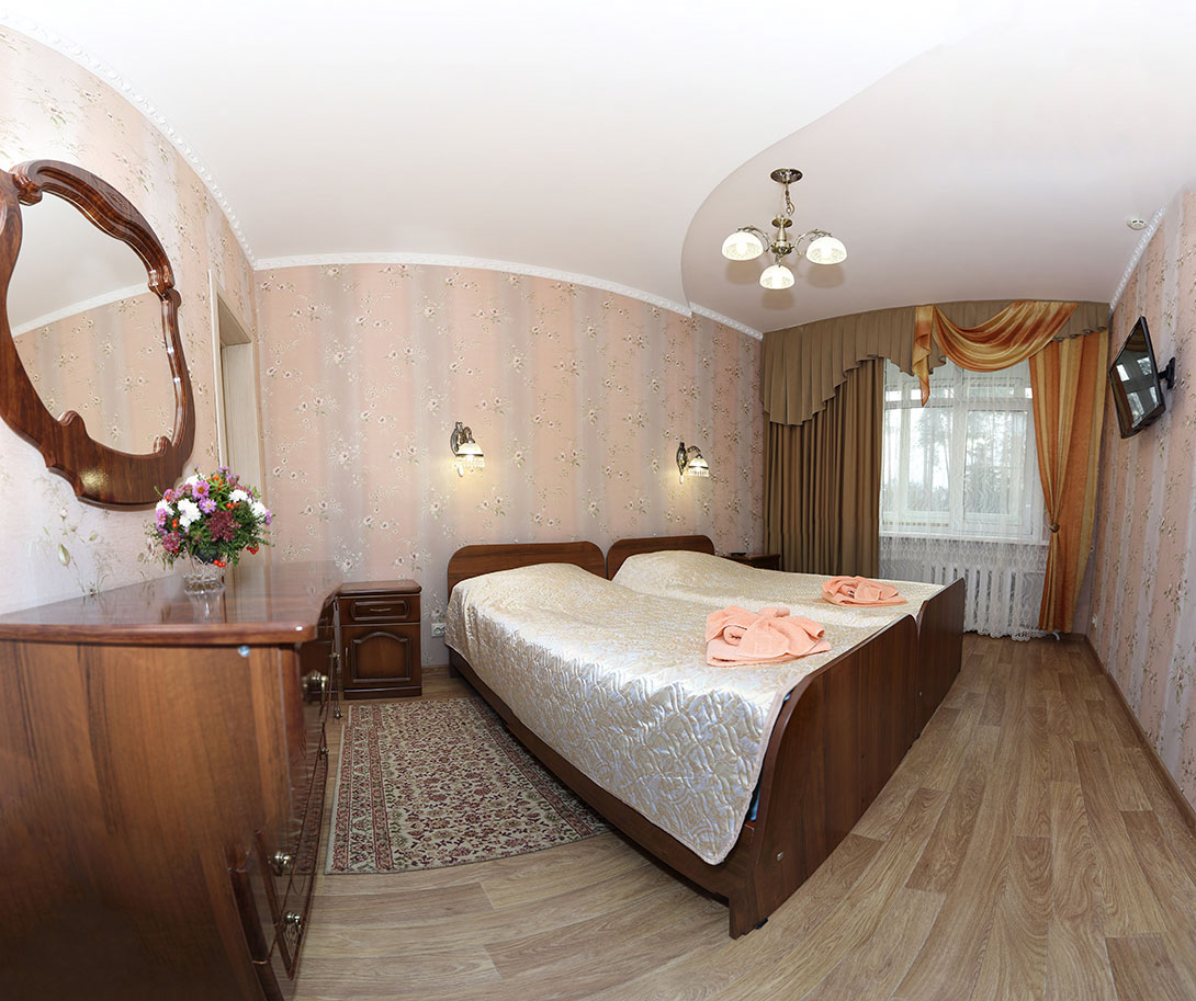 Спальня: две отдельно стоящие кровати или одна двухспальная кровать, две прикроватные тумбочки, набор полотенец