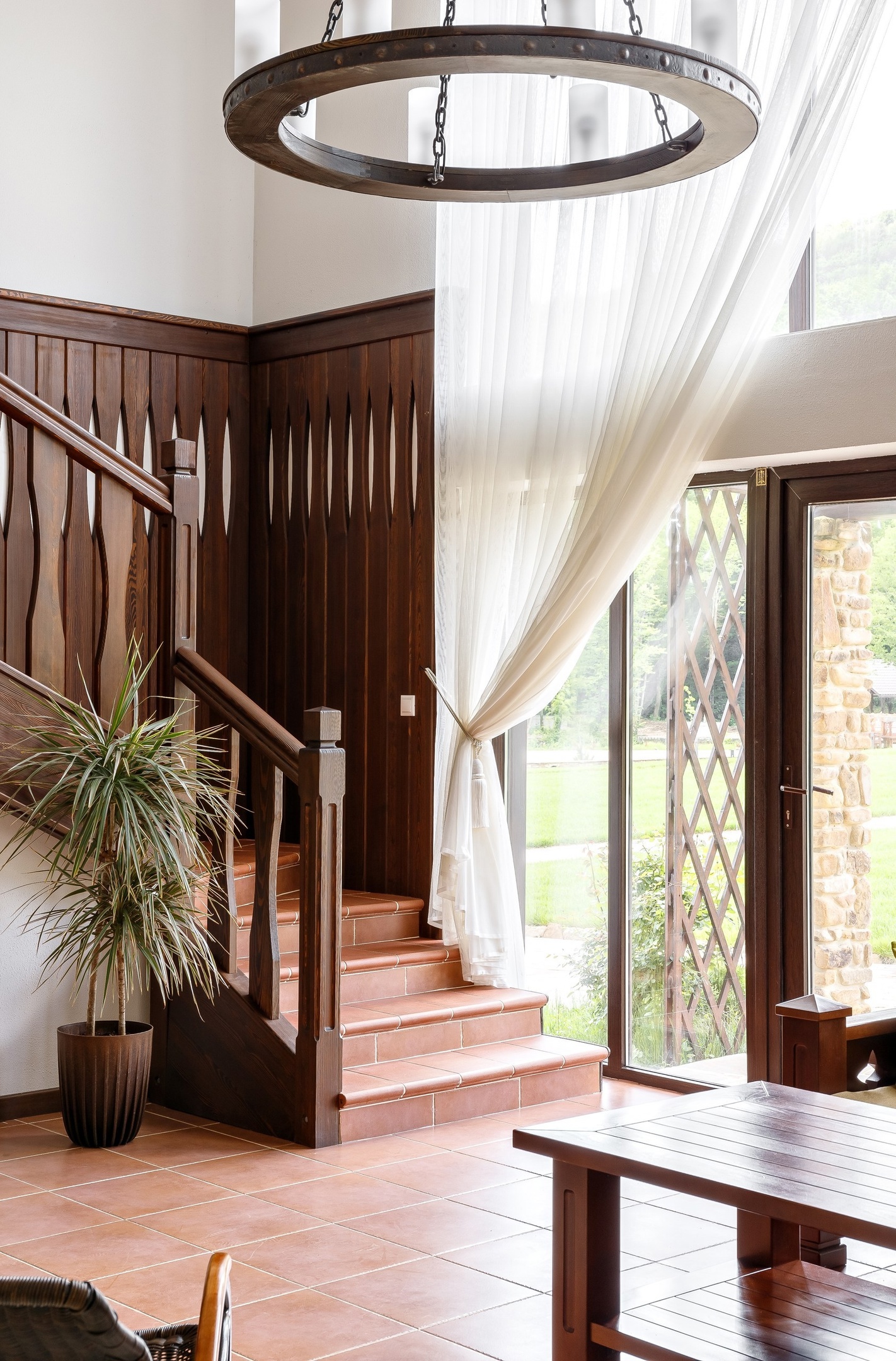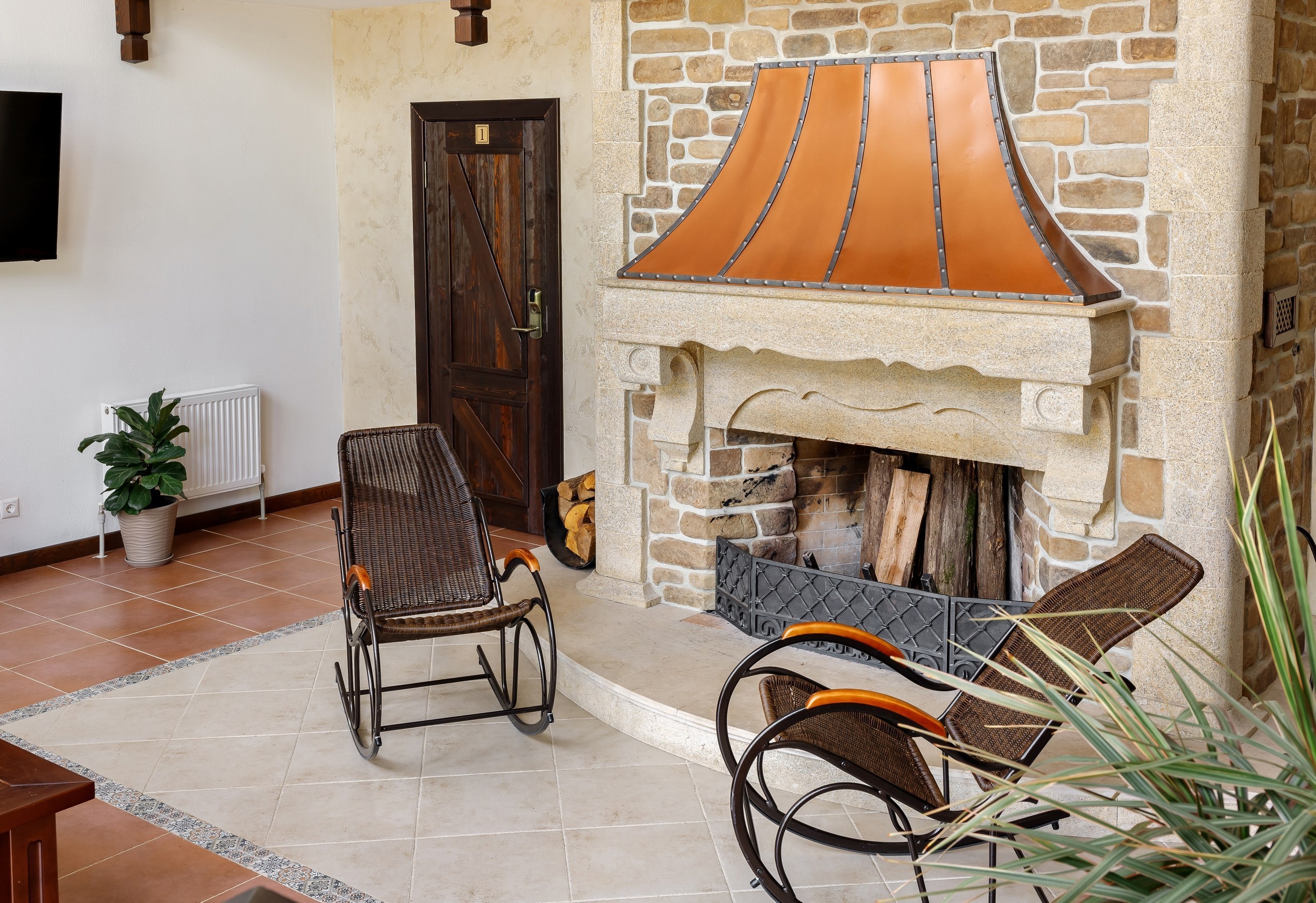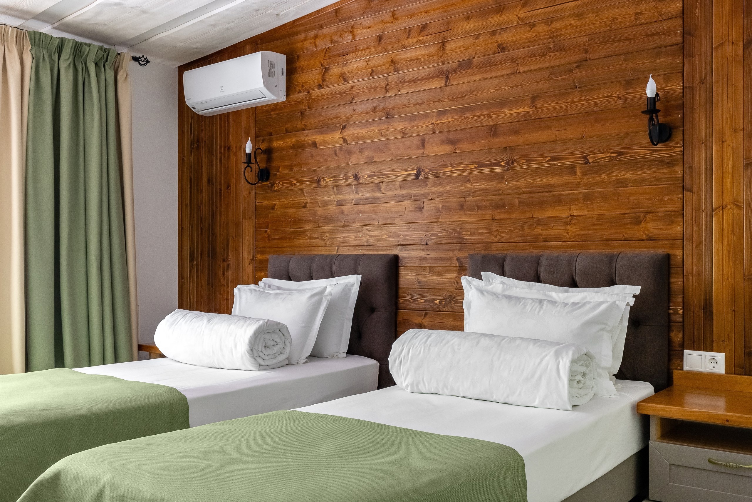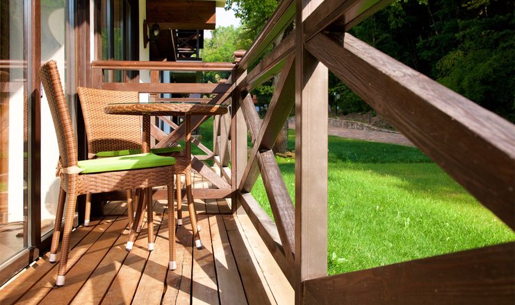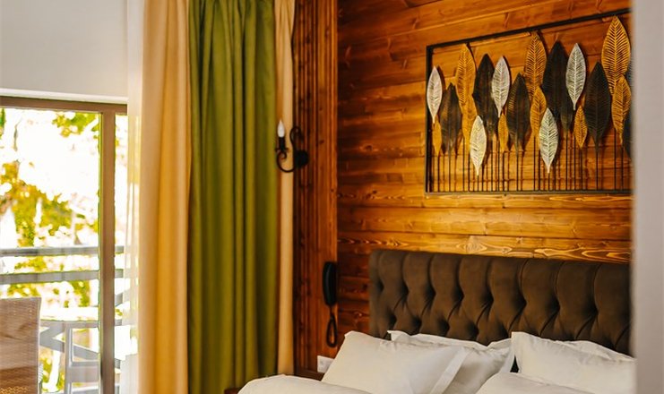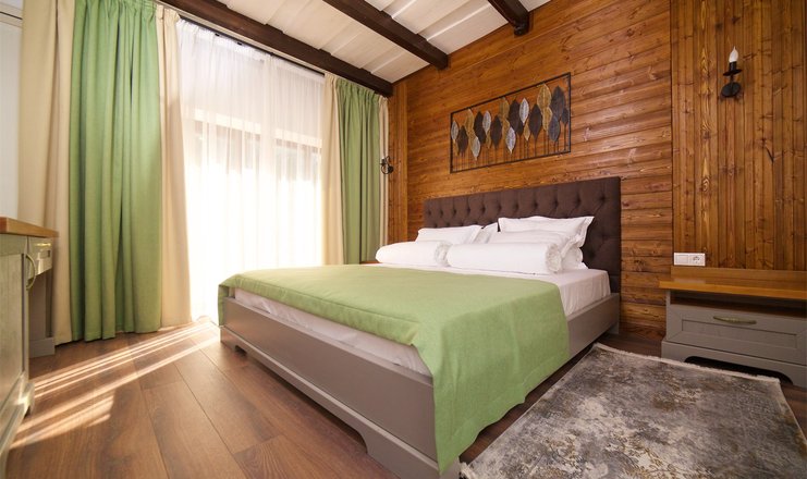 В номере: общий холл с камином и кулером с водой, кровать двуспальная, прикроватные тумбочки, стол, стулья, шкаф, гладильная доска, кондиционер, мини-холодильник, набор посуды, телевизор, утюг, чайный набор посуды, электрочайник