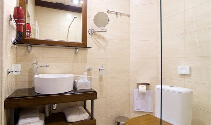 Санузел: душ, раковина, унитаз, тапочки, туалетные принадлежности, фен, халат