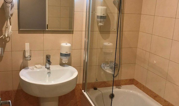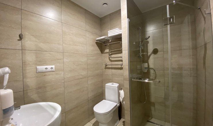Санузел: душевая кабина, раковина, унитаз, фен, гигиенические принадлежности, тапочки