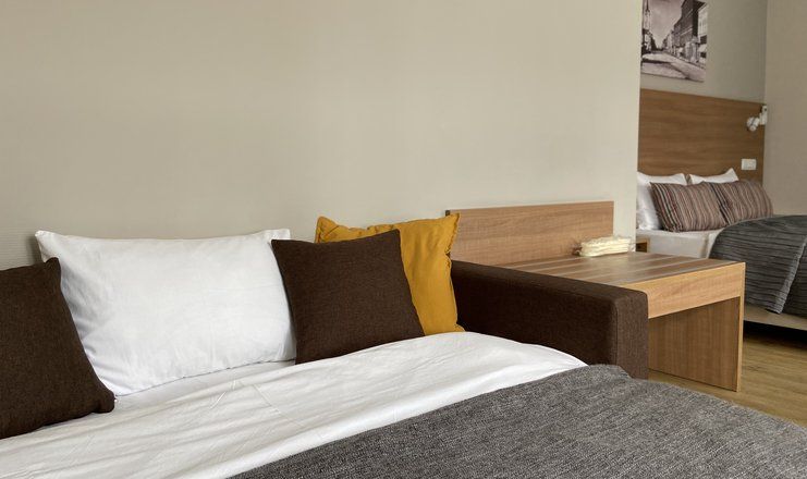 В номере: кровать двуспальная, прикроватные тумбочки, стол, стулья, шкаф, диван, сейф, сплит-система, телевизор, телефон, холодильник