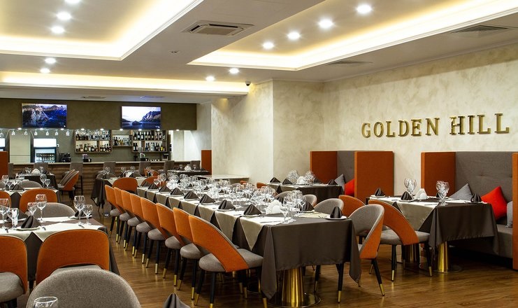 Ресторанный комплекс «Golden Hill» приглашает гостей на любое мероприятие. Нас отличает исключительное качество авторской кухни, безупречный сервис и просторные залы, которые могут вместить до 200 человек. Интерьер главного зала ресторана выполнен в классическом стиле и позволяет адаптироваться под любую тематику вечера. Гармоничное сочетание кремового и белого оттенков интерьера создает приятную атмосферу для проведения свадеб, юбилеев, корпоративов и дней рождения. Блюда от нашего шеф-повара непременно порадуют вкусовые рецепторы самого искушенного гурмана.