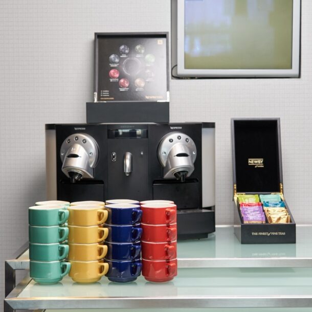 Может быть использован в качестве переговорной комнаты. Оборудован панорамными окнами, ЖК экраном 65″, системой кондиционирования, удобной мебелью.