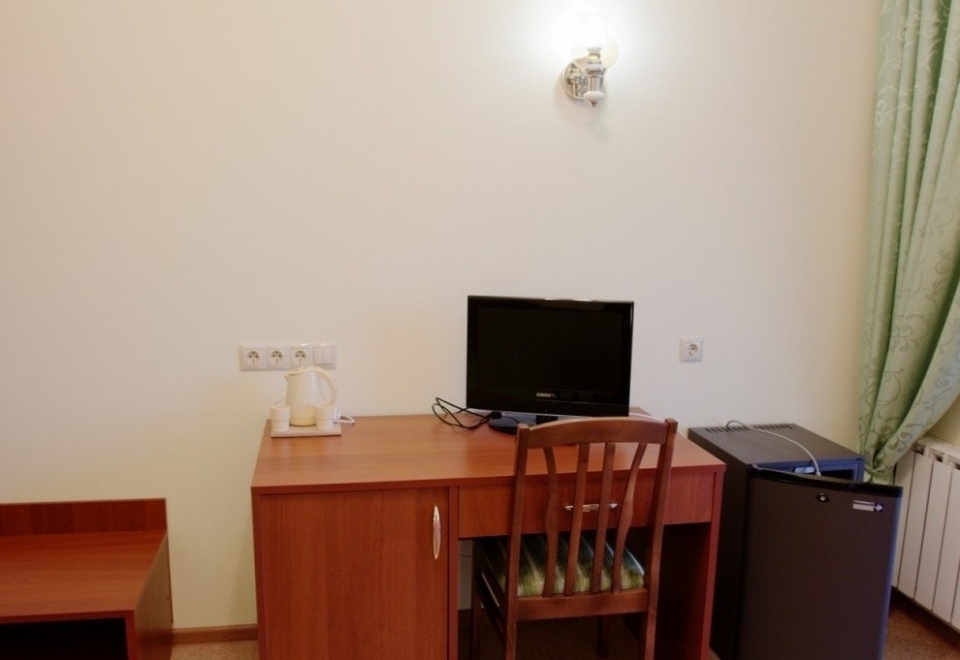 В номере: две односпальные кровати, стулья, кухонная мебель, телевизор, холодильник, электрочайник, набор посуды.