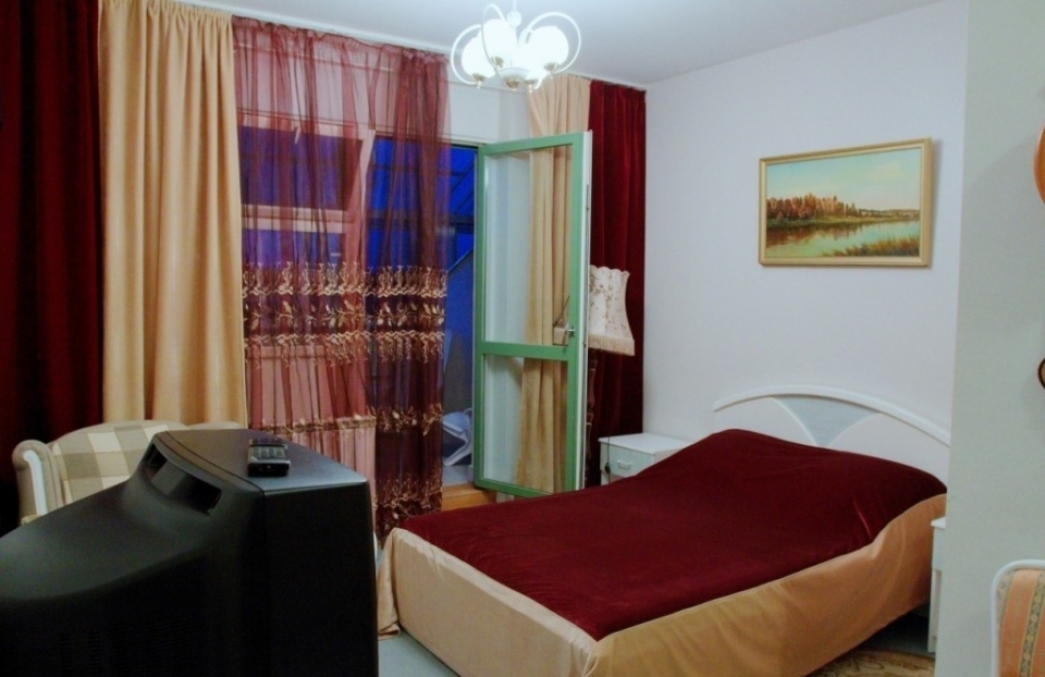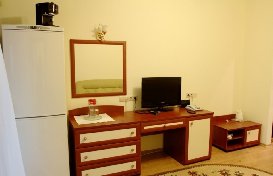 В номере: двуспальная кровать, набор мягкой мебели, стулья, телевизор, холодильник, электрочайник, набор посуды.