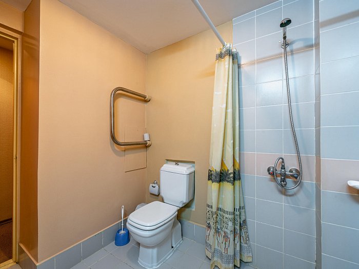 Санузел: душ, раковина, унитаз, полотенца, тапочки