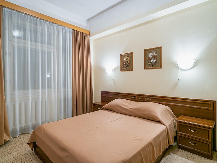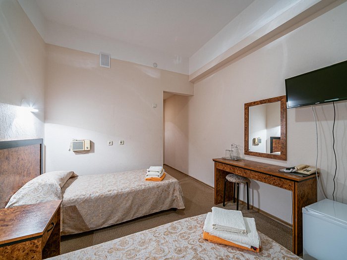 В номере: две односпальные кровати или одна двуспальная, прикроватные тумбы, зеркало, шкаф для одежды, сейф, письменный стол, телевизор, кондиционер, фен, холодильник, Wi-Fi