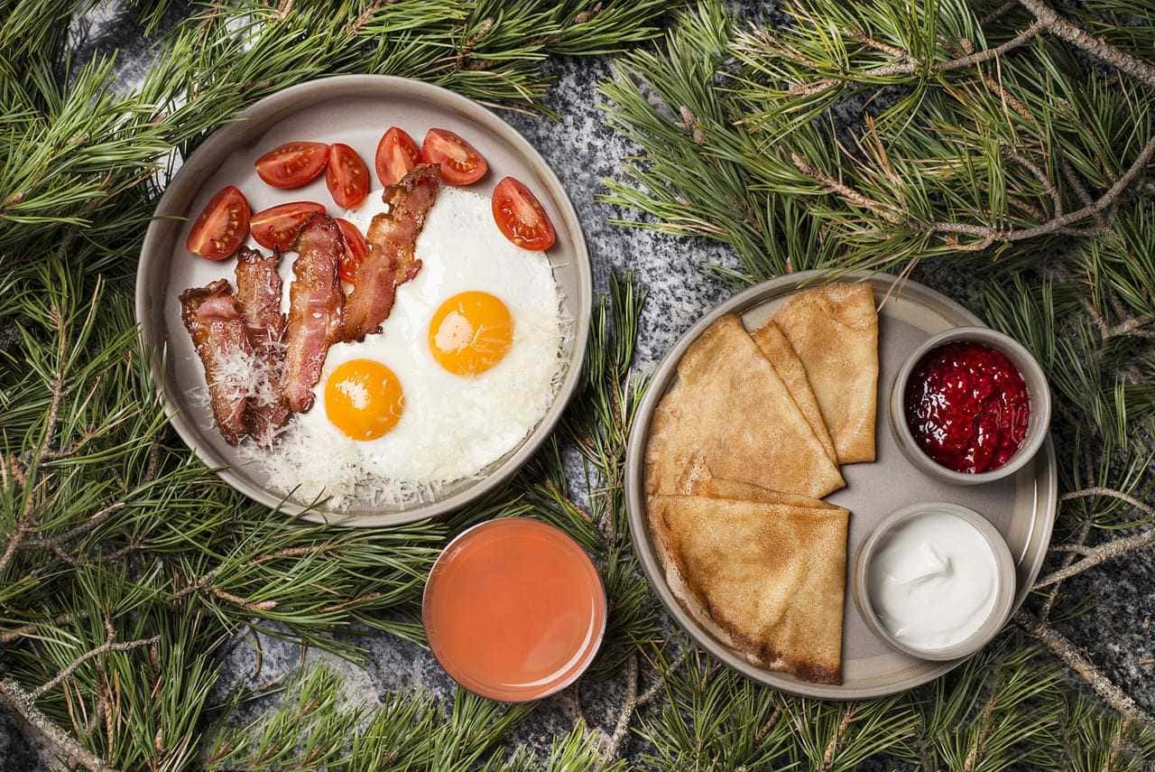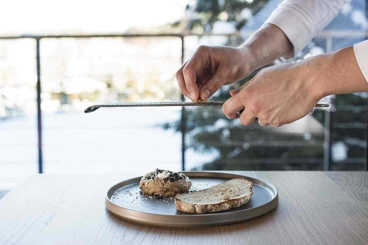 В меню представлены блюда истинно карельской кухни: традиционная уха, калитки, рыба. Традиционные карельские калитки – это горячие открытые карельские пирожки с наливками, начинками, припеками, смазанные сливочным маслом. В нашей интерпретации — это ржаное тесто с подушечкой из картофельного крема, сверху мы кладем тартар из карельской форели и украшаем завитками зеленого лука. Можно есть их с утра и до ночи!