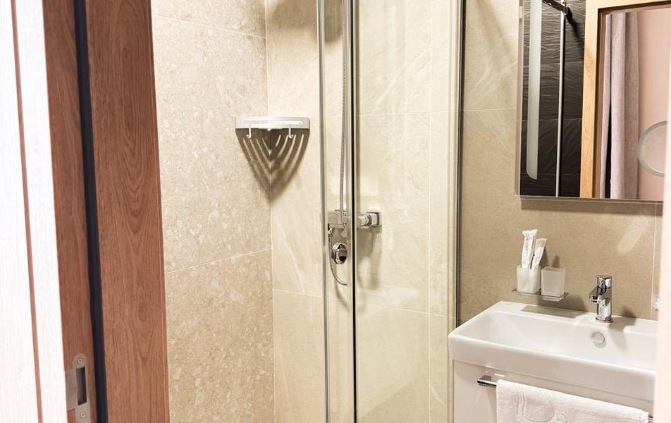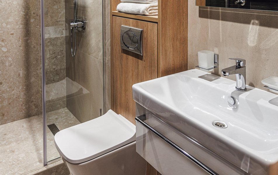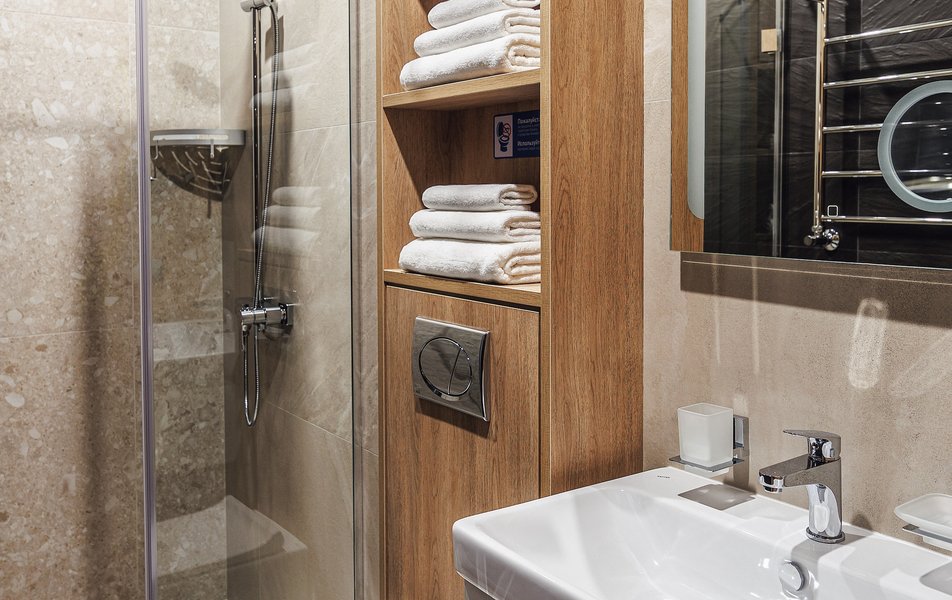 Санузел: душевая кабина, раковина, унитаз, туалетные принадлежности, фен