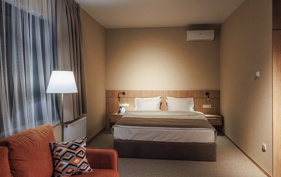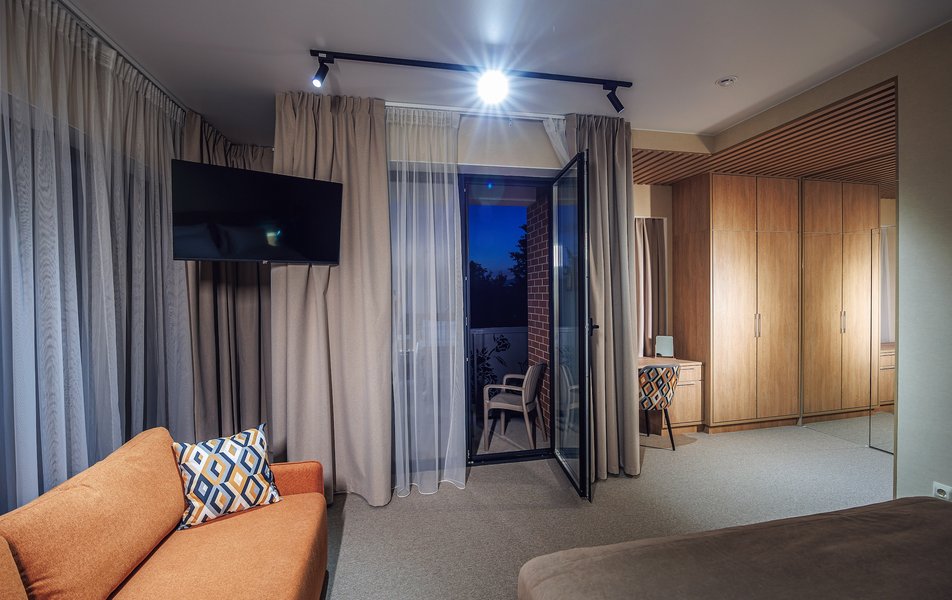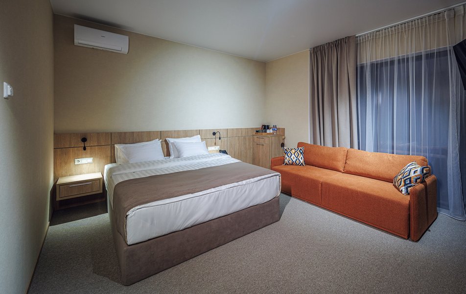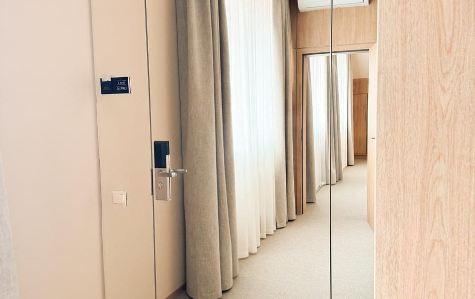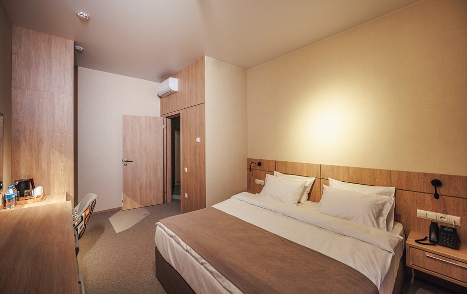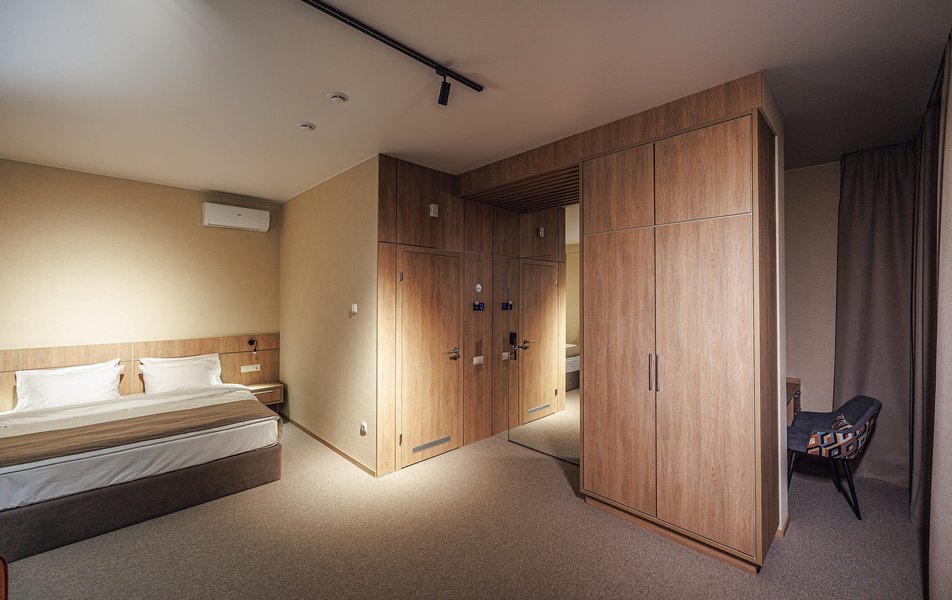 В номере: вешалка, диван раскладной, зеркало, ковровое покрытие, кровать двуспальная, прикроватные тумбочки, стол, столик туалетный, стул, шкаф, кондиционер, набор посуды, сейф, телевизор, телефон, холодильник, электрочайник