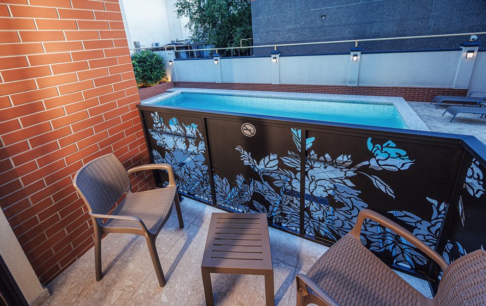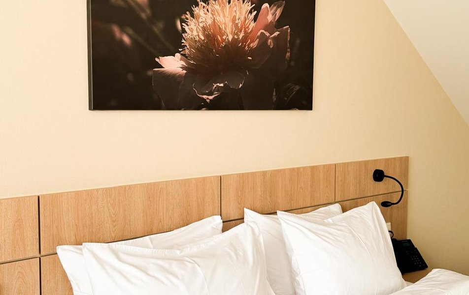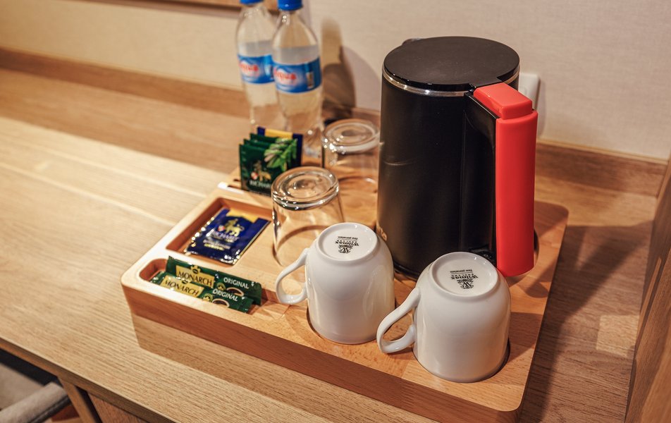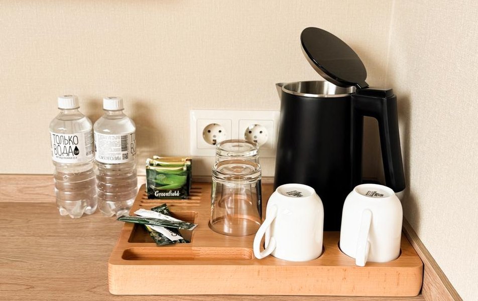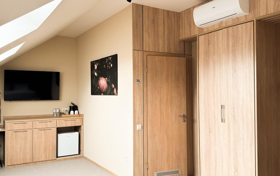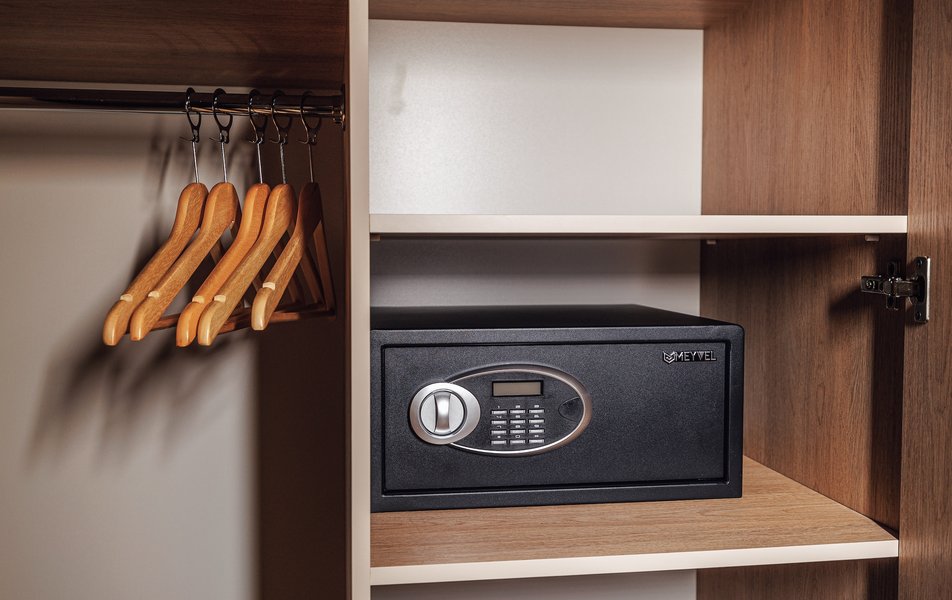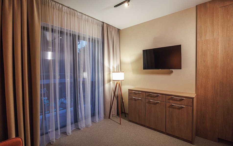 В номере: вешалка, диван раскладной, зеркало, ковровое покрытие, кровать двуспальная, прикроватные тумбочки, стол, столик туалетный, стул, шкаф, кондиционер, набор посуды, сейф, телевизор, телефон, холодильник, электрочайник
