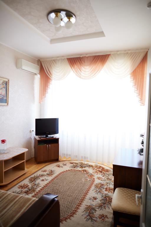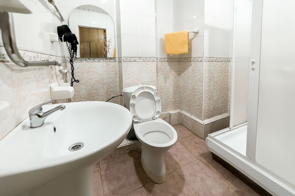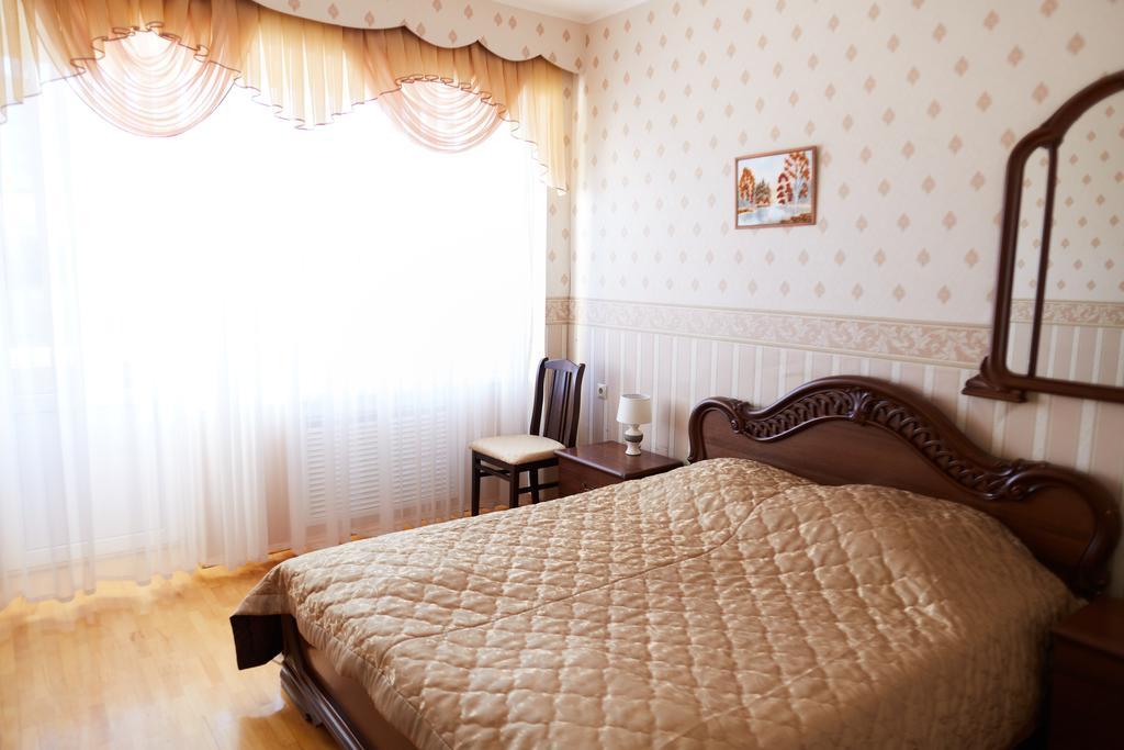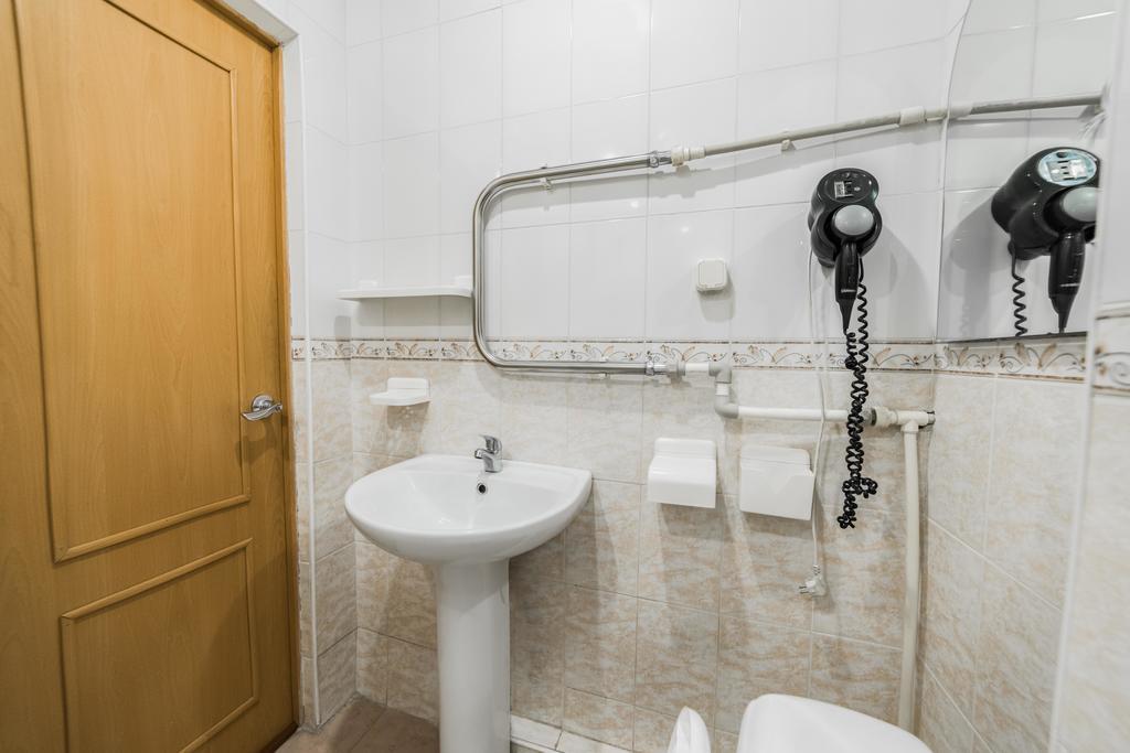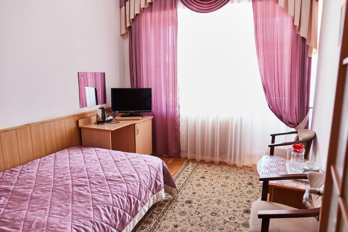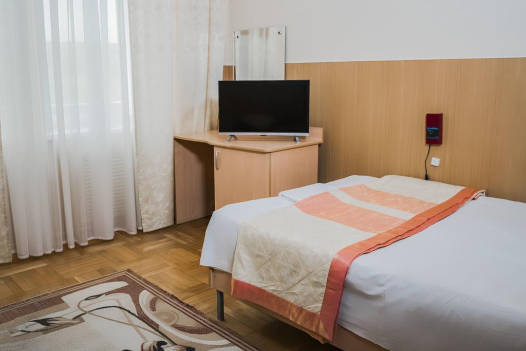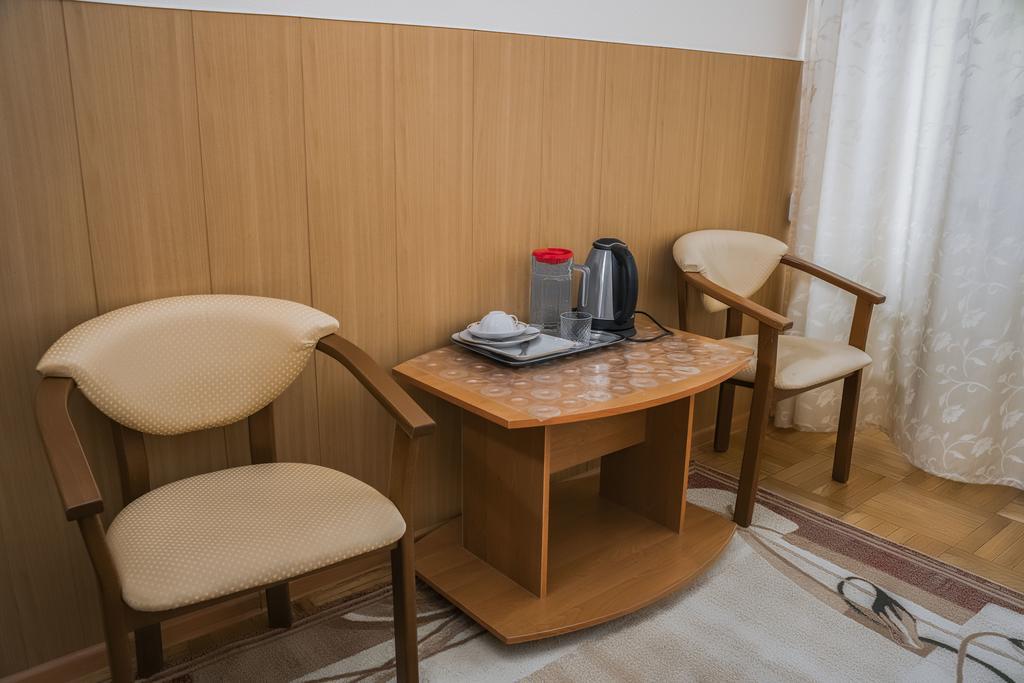 В номере: полутораспальная кровать, тумба, стол, журнальный столик, мягкие стулья, телевизор, холодильник, чайник, кондиционер, набор посуды