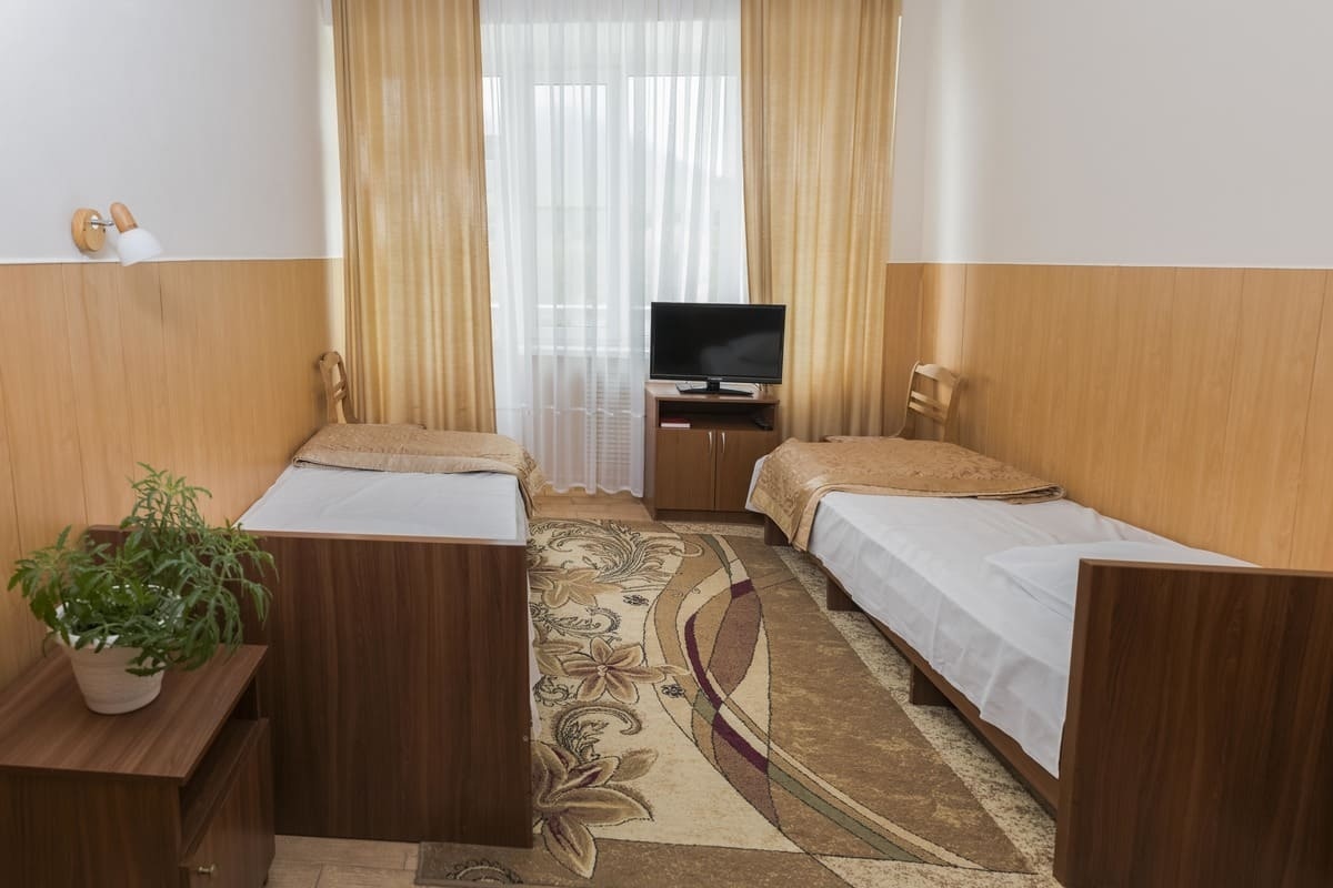 В номере: две односпальные кровати, тумбы, журнальный столик, стулья, телевизор, холодильник, чайник