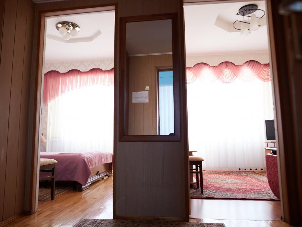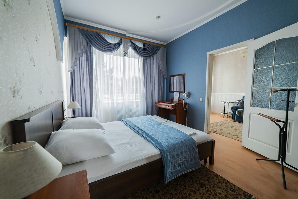 В номере: две комнаты: спальня и гостиная, одна двуспальная либо две односпальные кровати, тумбы, стол, журнальный столик, мягкие стулья, мягкая мебель, телевизор, холодильник, чайник, кондиционер, набор посуды