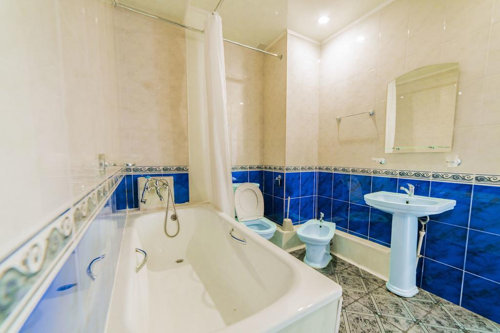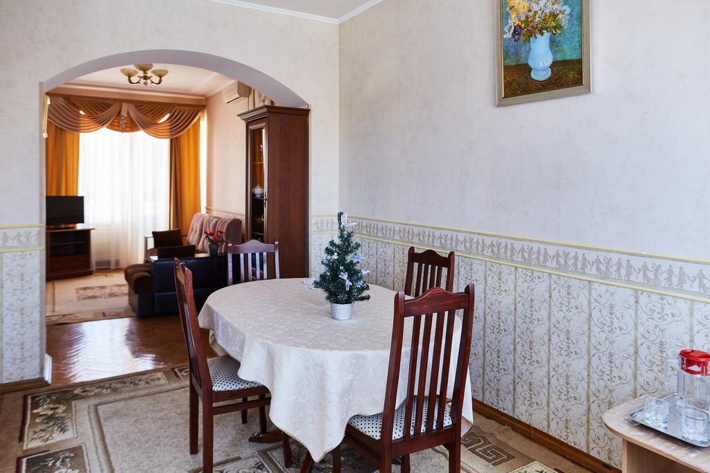 В номере: три комнаты: спальня, гостиная, столовая, двуспальная кровать, тумбы, шкаф, стол, журнальный столик, мягкие стулья, мягкая мебель, шкаф с посудой, обеденная зона, гладильная доска с утюгом, сейф, свч-печь, телевизор, холодильник, чайник, кондиционер