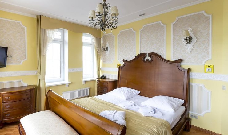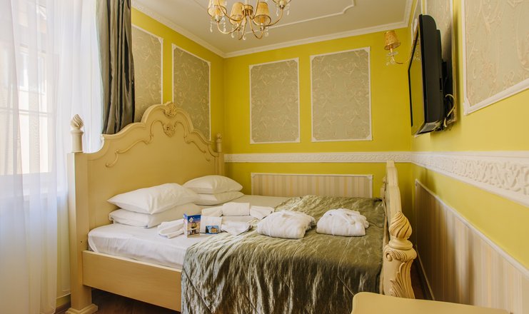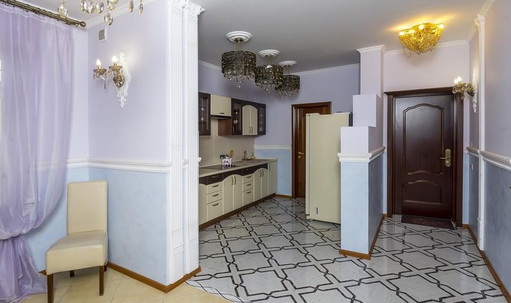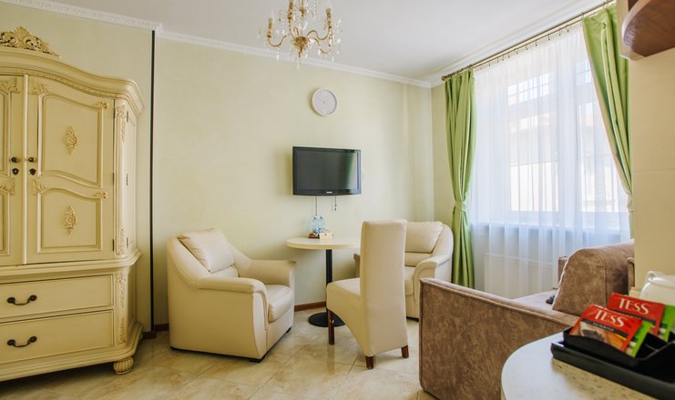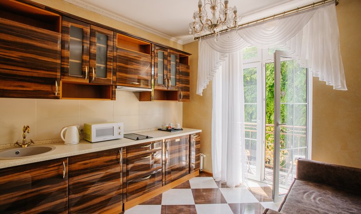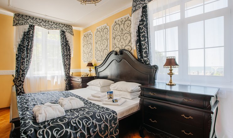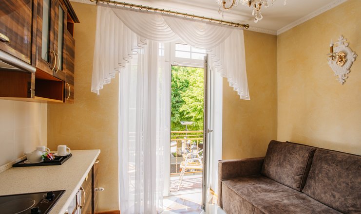 В номере: диван, зеркало, комод, кровать двуспальная, кухонная мебель, прикроватные тумбочки, стол, стулья, шкаф, гладильная доска, кондиционер, микроволновая печь, набор посуды, плита электрическая, сейф, телевизор, телефон, утюг, холодильник, чайный набор посуды, электрочайник