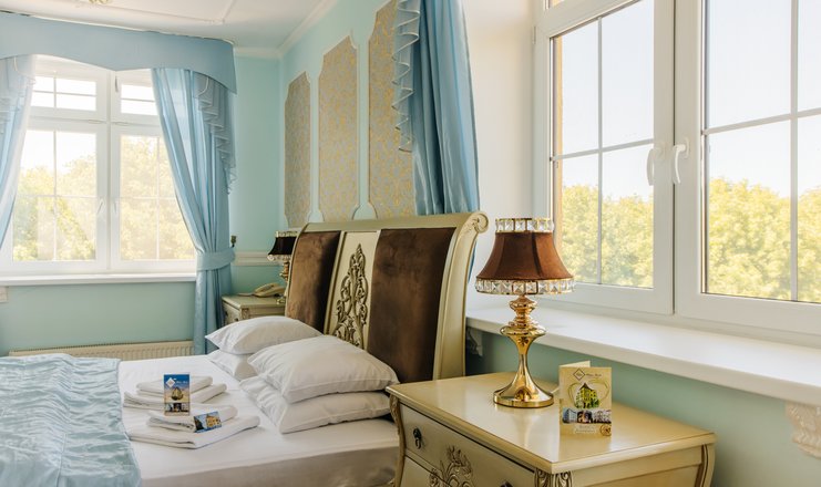 В номере: вешалка, диван, зеркало, комод, кровать двуспальная, кровать односпальная: детская, кухонная мебель, прикроватные тумбочки, стол, стулья, шкаф, гладильная доска, кондиционер, набор посуды, плита электрическая, сейф, телевизор, телефон, утюг, холодильник, чайный набор посуды, электрочайник