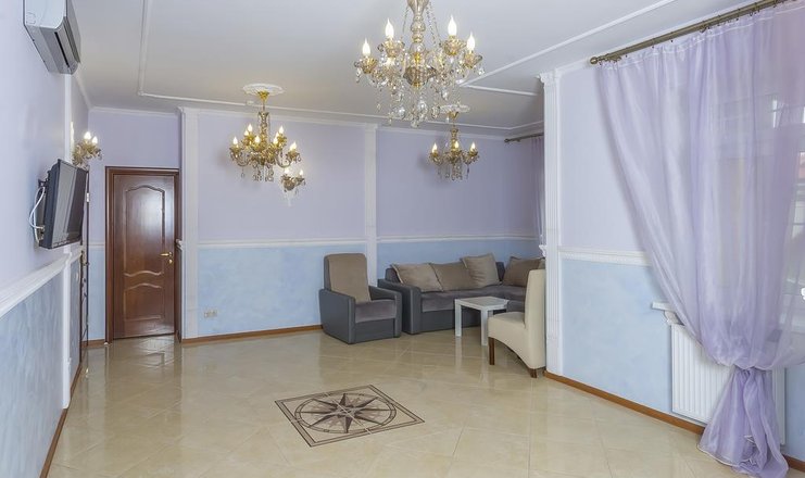 В номере: вешалка, диван, зеркало, комод, кровать двуспальная, кухонная мебель, прикроватные тумбочки, стулья, шкаф, гладильная доска, кондиционер, набор посуды, плита электрическая, сейф, телевизор, телефон, утюг, холодильник, чайный набор посуды, электрочайник