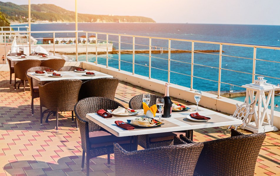 Одно удовольствие сидеть в уютном кафе на берегу моря и любоваться закатом, слушая шум прибоя.