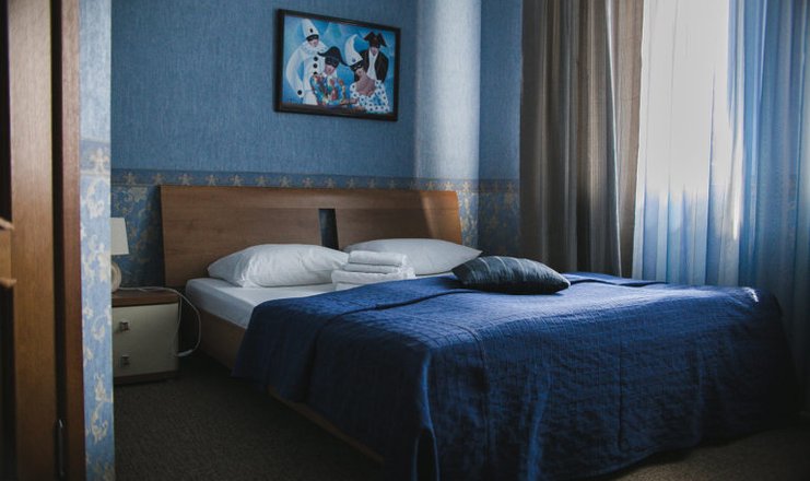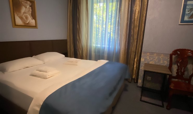 В номере: кровать двуспальная, прикроватные тумбочки, стол, стулья, кондиционер, мини-холодильник, сейф, телевизор ЖК, телефон
