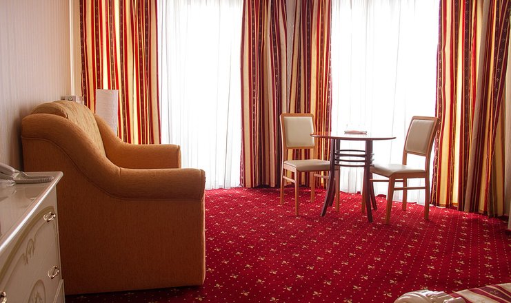 В номере: кровать двуспальная, прикроватные тумбочки, стол, стулья, шкаф, кондиционер, мини-холодильник, сейф, телевизор ЖК