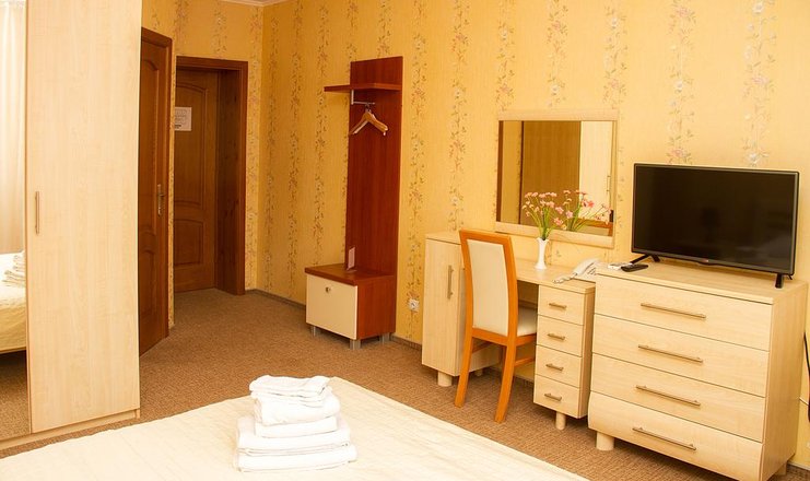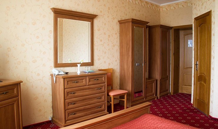В номере: диван, зеркало, кровать двуспальная, прикроватные тумбочки, стол, стулья, кондиционер, мини-холодильник, сейф, телевизор ЖК, телефон