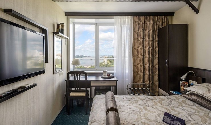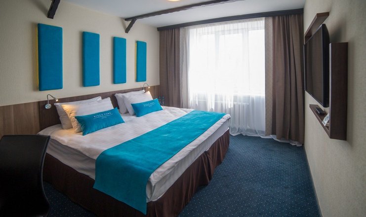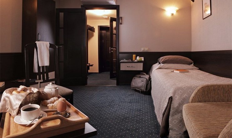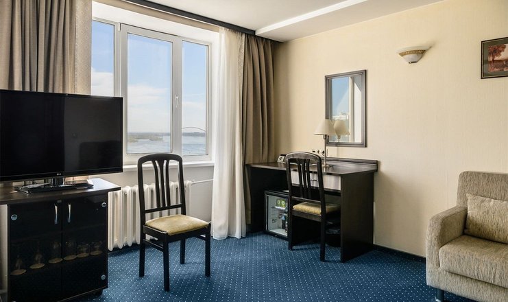 В номере: вешалка, зеркало,кресла, кровати односпальные или одна двуспальная, прикроватные тумбочки, стол, стулья, шкаф, кондиционер, телевизор, телефон, холодильник, набор посуды