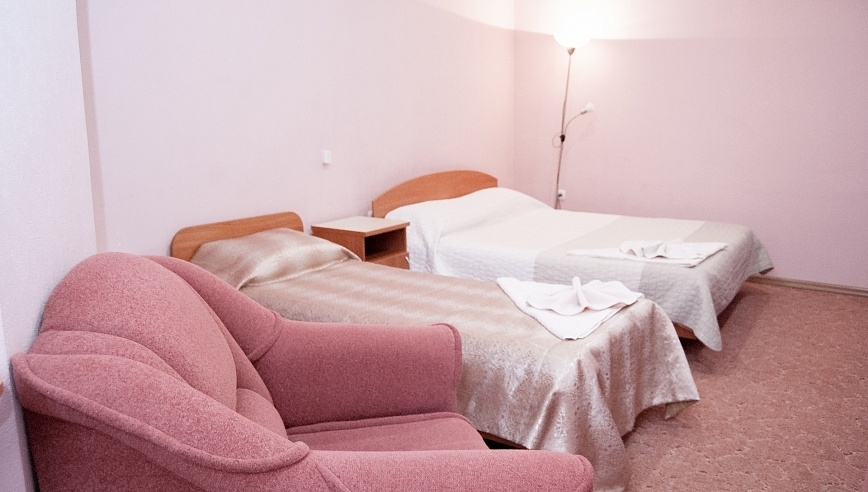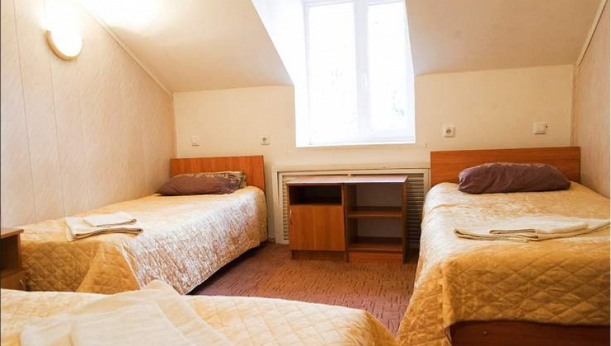 В номере: Трёхместный однокомнатный номер со спальней (три односпальные кровати), шкаф, тумба прикроватная, набор для ванной.