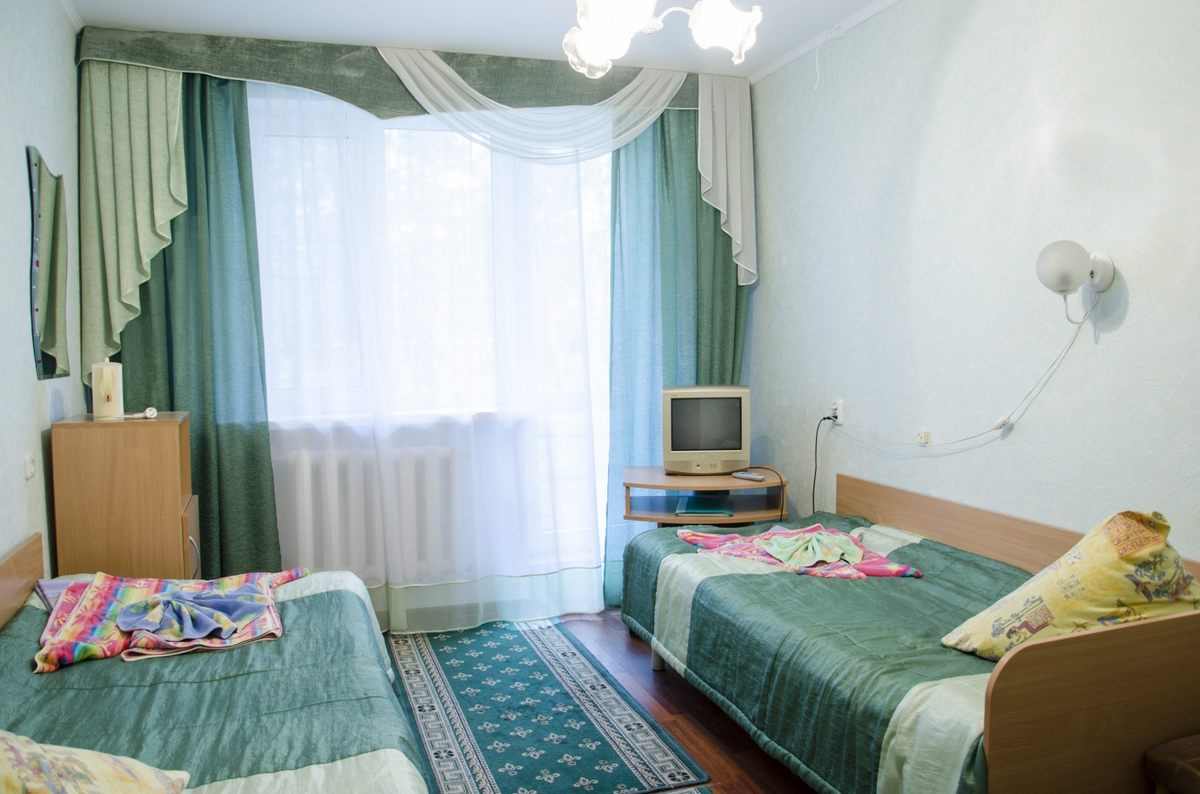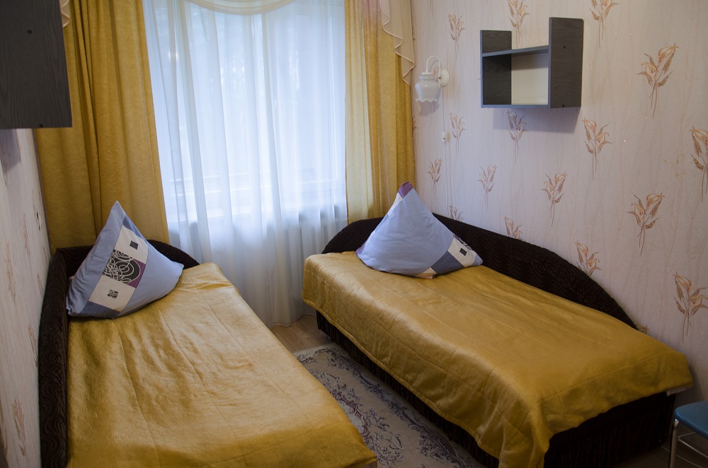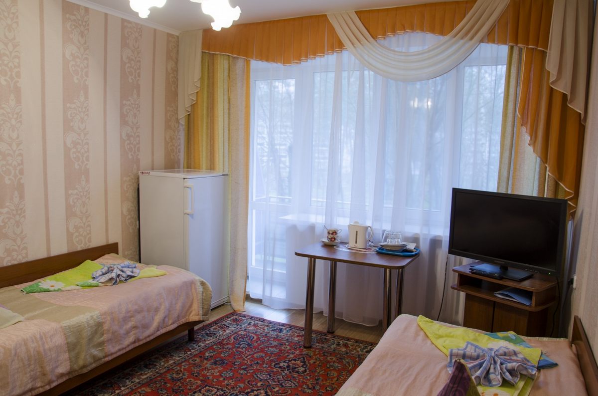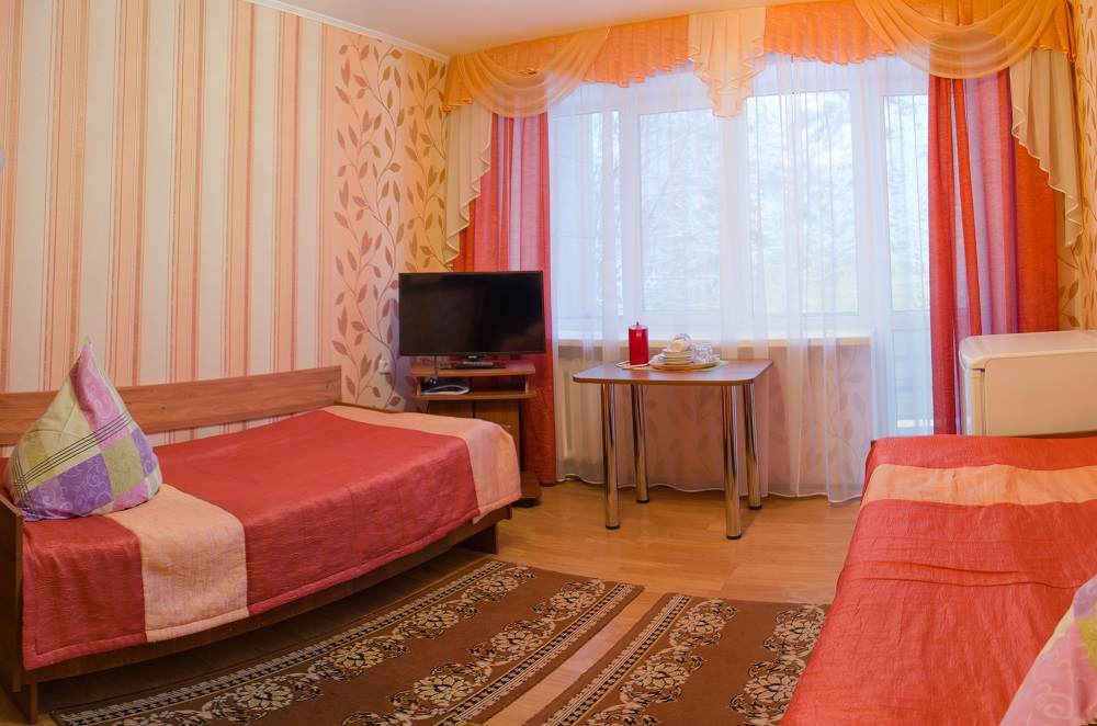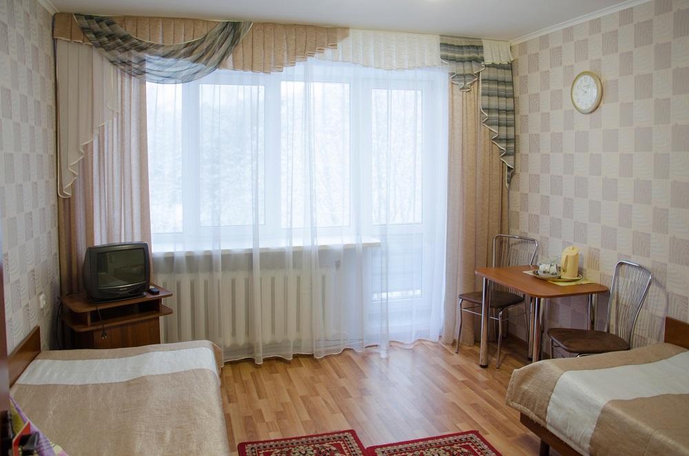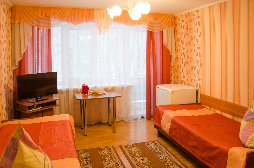В номере: две односпальные кровати, прикроватные тумбы, телевизор, тумба под телевизор, шкаф для одежды, стол, стулья, холодильник, электрочайник, посуда