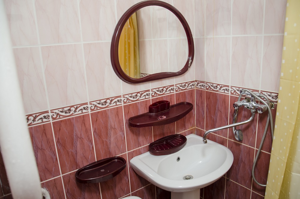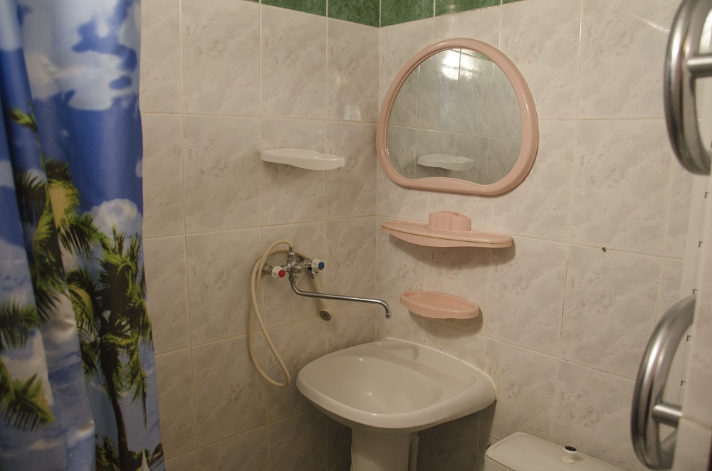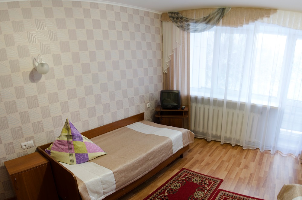 В номере: диван, тумба под телевизор, шкаф для одежды, стол, стулья, холодильник, утюг, гладильная доска, электрочайник, посуда