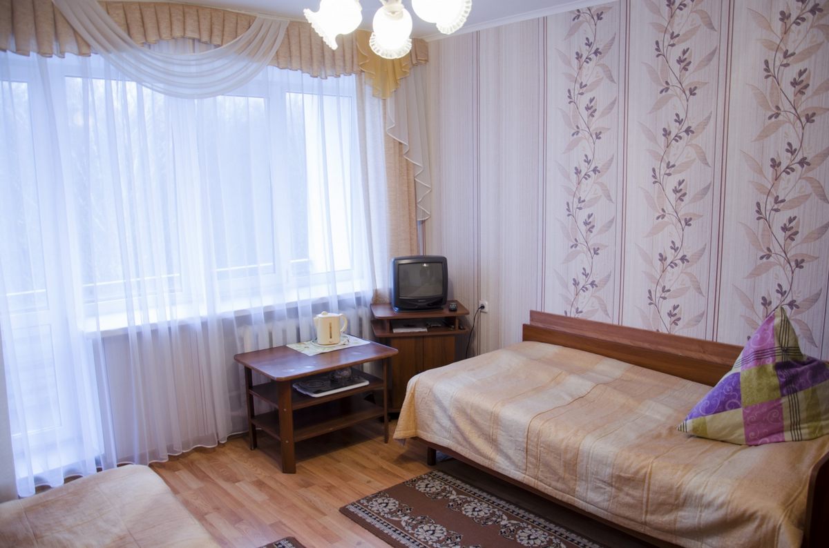 В номере: две односпальные кровати, прикроватные тумбы, тумба под телевизор, шкаф для одежды, стол, стулья, холодильник, утюг, гладильная доска, электрочайник, посуда