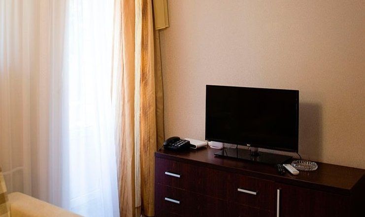 В номере: кровать двуспальная, прикроватные тумбочки, шкаф, мягкая мебель, телевизор, холодильник, чайный набор посуды