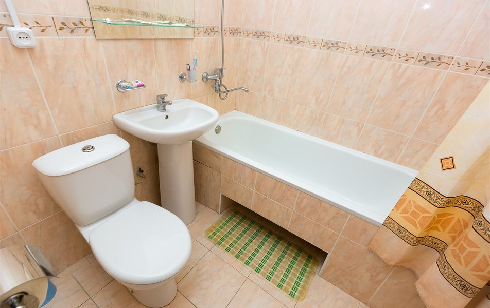 Санузел: ванна, раковина, унитаз, туалетные принадлежности, фен