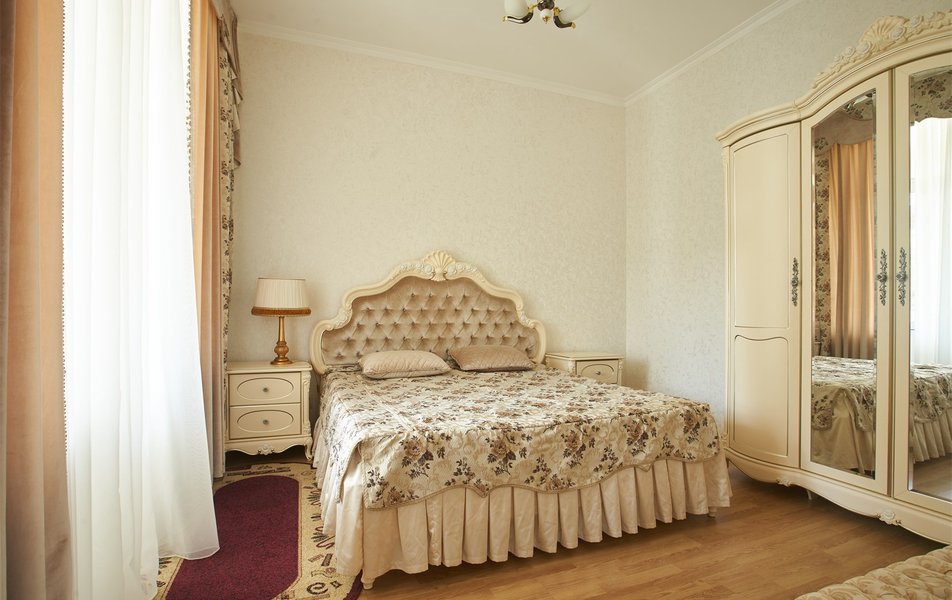 В номере: вешалка, зеркало, кресло, диван, кровати односпальные /одна двуспальная кровать, прикроватные тумбочки, стол, столик журнальный, шкаф, телевизор, телефон, холодильник, чайный набор посуды, электрочайник