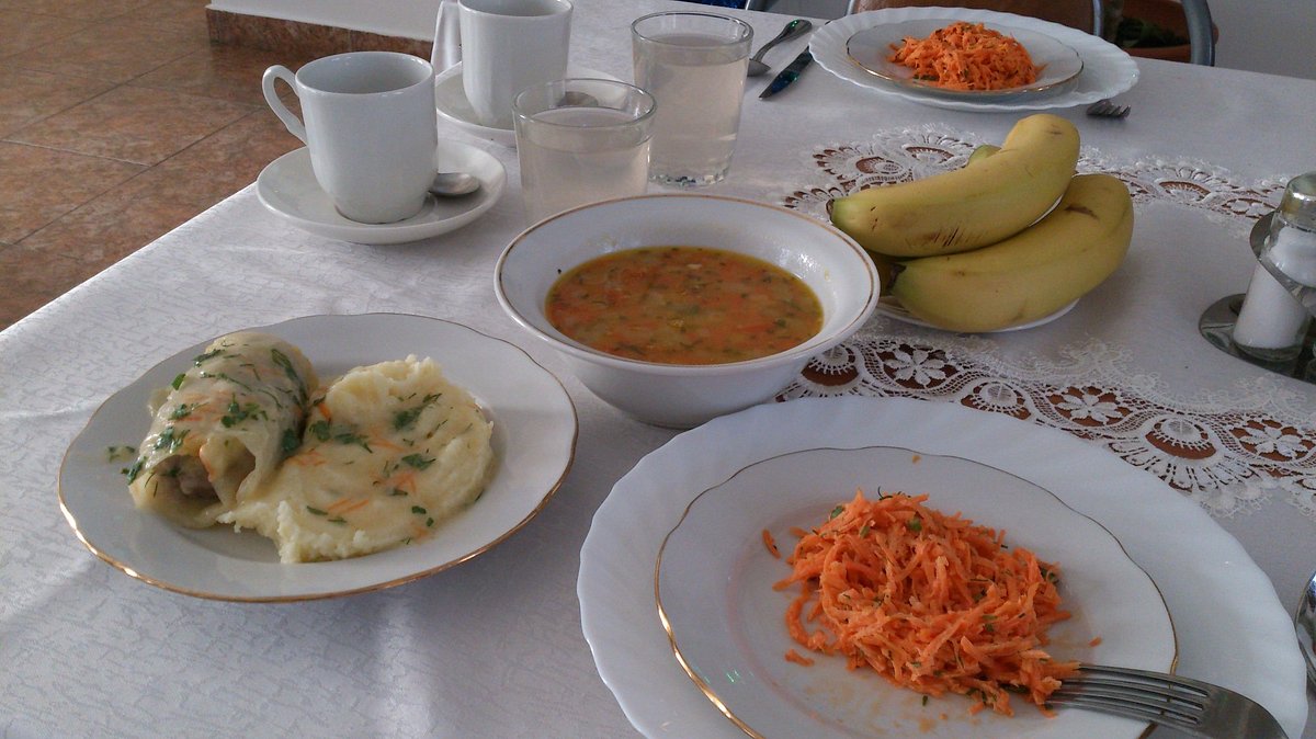 В столовой гостям предлагаются завтрак, обед и ужин, состоящие из нескольких блюд: свежие салаты, горячие закуски, основные блюда, а также десерты. Завтраки могут включать как классические блюда, такие как овсянка, яйца, так и разнообразные выпечку и свежие фрукты. На обед и ужин предусмотрены меню, в которое входят мясные и рыбные блюда, гарниры из овощей, круп и картофеля, а также вегетарианские опции.