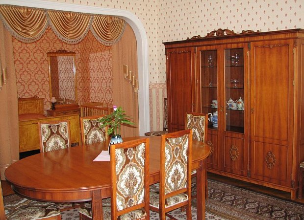 В номере: большая двуспальная кровать, одна односпальная кровать, диван-кровать, телевизор, кабельное ТВ, холодильник, фен, кондиционер, туалетный столик, тумбы, шкаф для одежды, сушилка для белья, набор посуды, чайник, чайный набор, Wi-Fi в общественных зонах
