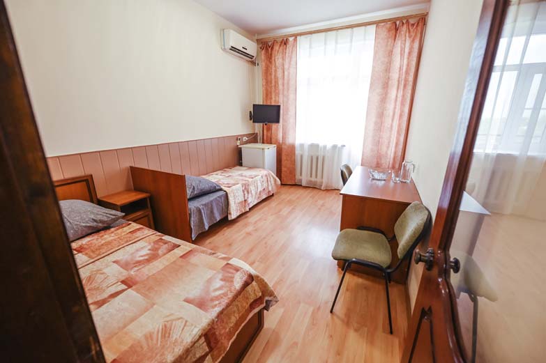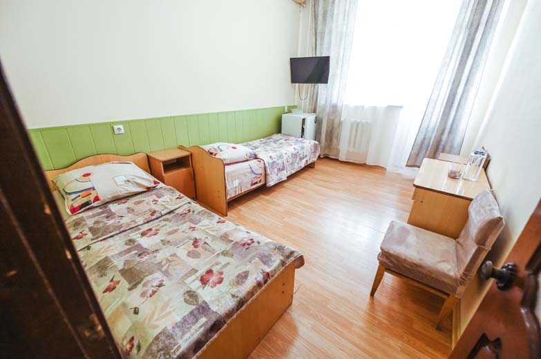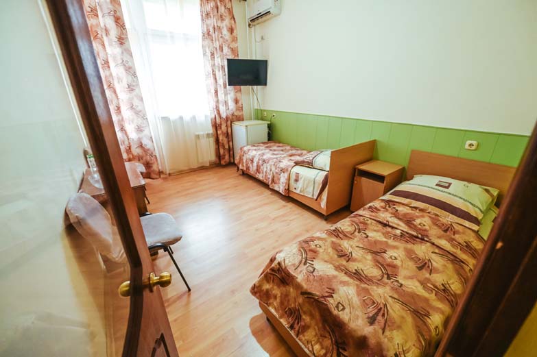 Оснащене номера: вешалка, кровати односпальные, прикроватные тумбочки, стол, стулья, шкаф, сплит-система, телевизор, холодильник
