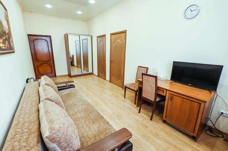 Оснащение номера: вешалка, диван, кровать двуспальная, прикроватные тумбочки, стол, стулья, шкаф, сплит-система, телевизор, холодильник