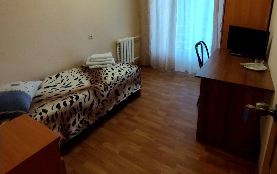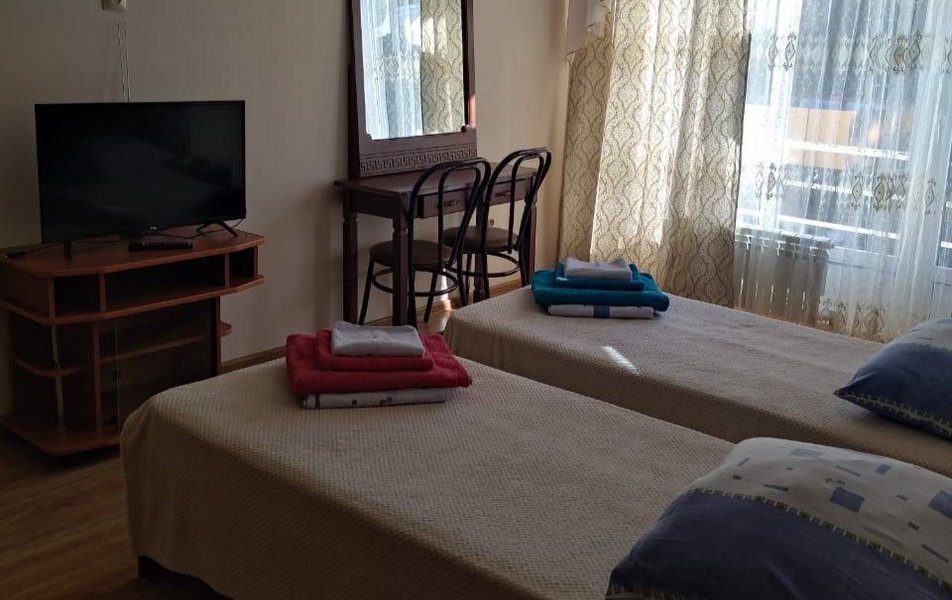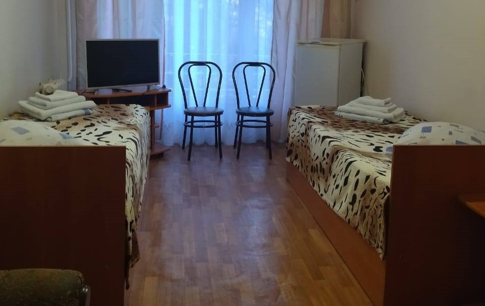 В номере: вешалка, зеркало, кровати односпальные, прикроватные тумбочки, стол, стул, шкаф, набор посуды, телевизор, холодильник, чайный набор посуды, электрочайник
