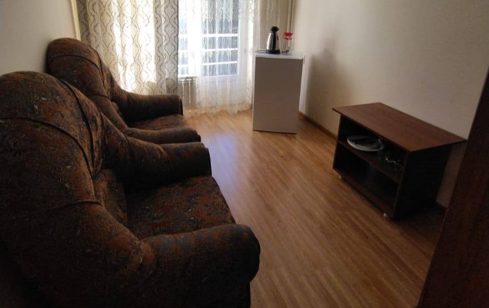 В номере: вешалка, зеркало, кресла, кровати односпальные, прикроватные тумбочки, стол, стул, шкаф, набор посуды, телевизор, холодильник, чайный набор посуды, электрочайник