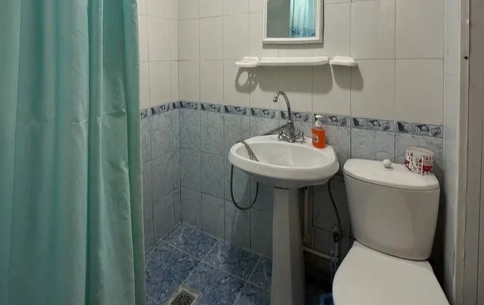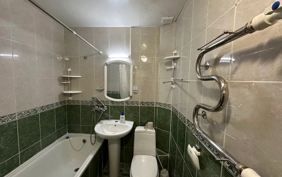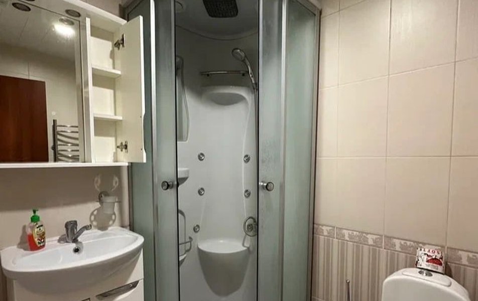 Санузел: душевая кабина, раковина, унитаз, туалетные принадлежности, фен