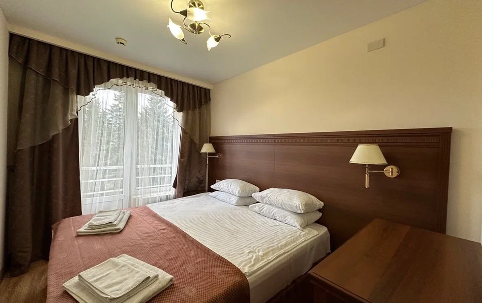В номере: вешалка, зеркало, кровать двуспальная, прикроватные тумбочки, стол, стул, шкаф, набор посуды, телевизор, холодильник, чайный набор посуды, электрочайник
