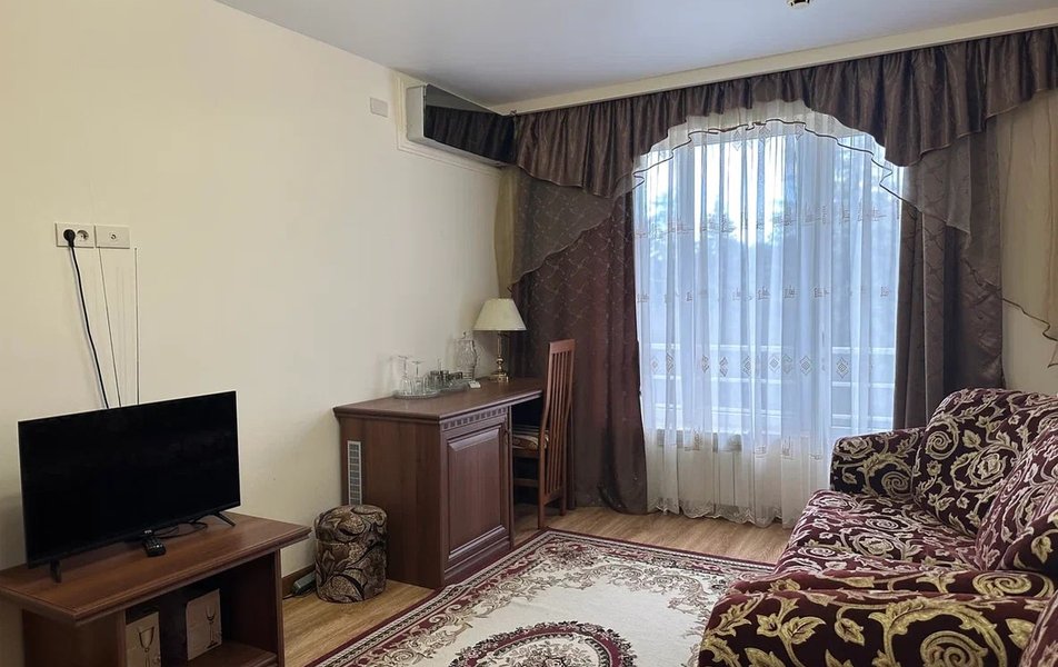 В номере: вешалка, зеркало, диван, кресла, кровать двуспальная, прикроватные тумбочки, стол, стул, шкаф, набор посуды, телевизор, холодильник, чайный набор посуды, электрочайник