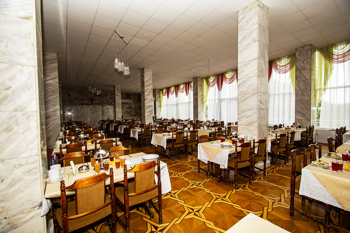 Интерьер обеденного зала, профессиональное оформление столов и блюд способствуют хорошему аппетиту и усвоению пищи. Круглогодично на столах гостей санатория присутствуют свежие овощи и фрукты. При приготовлении вкусных и сбалансированных блюде не используются усилители вкуса, транссжиры, консерванты и полуфабрикаты, а только свежайшие, натуральное эко-продукты местных фермеров.