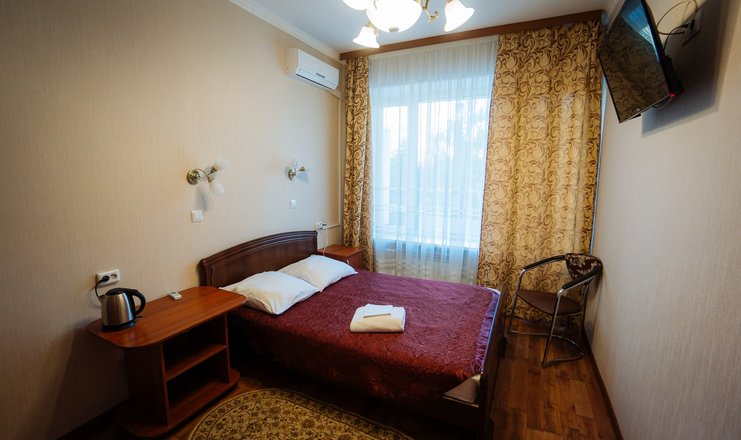 В номере: кровати односпальные или одна двуспальная, прикроватные тумбочки, стол, стул, шкаф, телевизор, холодильник, телефон, чайный набор посуды, электрочайник