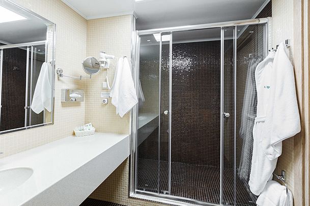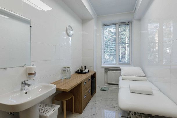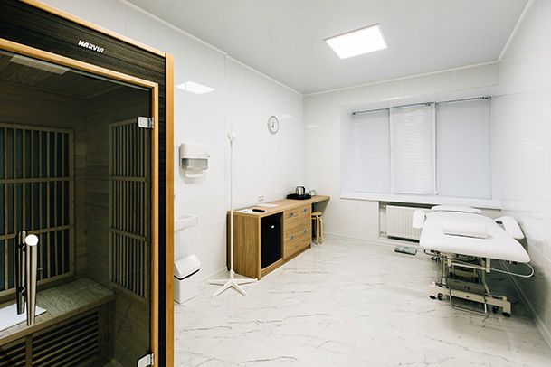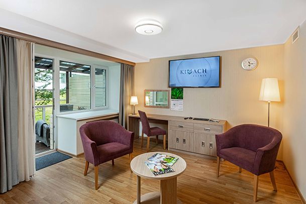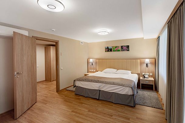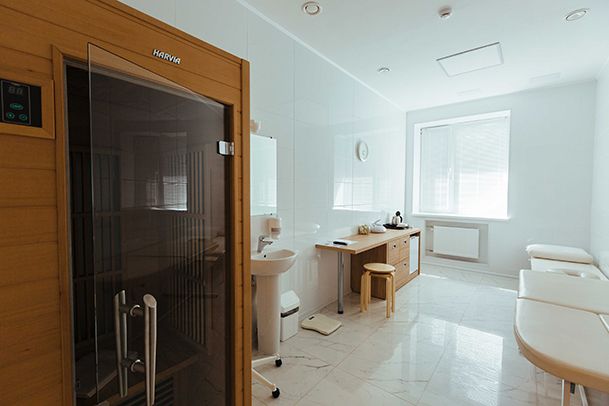 В номере: спальня и процедурная комната, две односпальные кровати либо одна двуспальная, прикроватные тумбы, стол, стул, кресло, журнальный стол, телевизор, холодильник, кондиционер, ИК-сауна